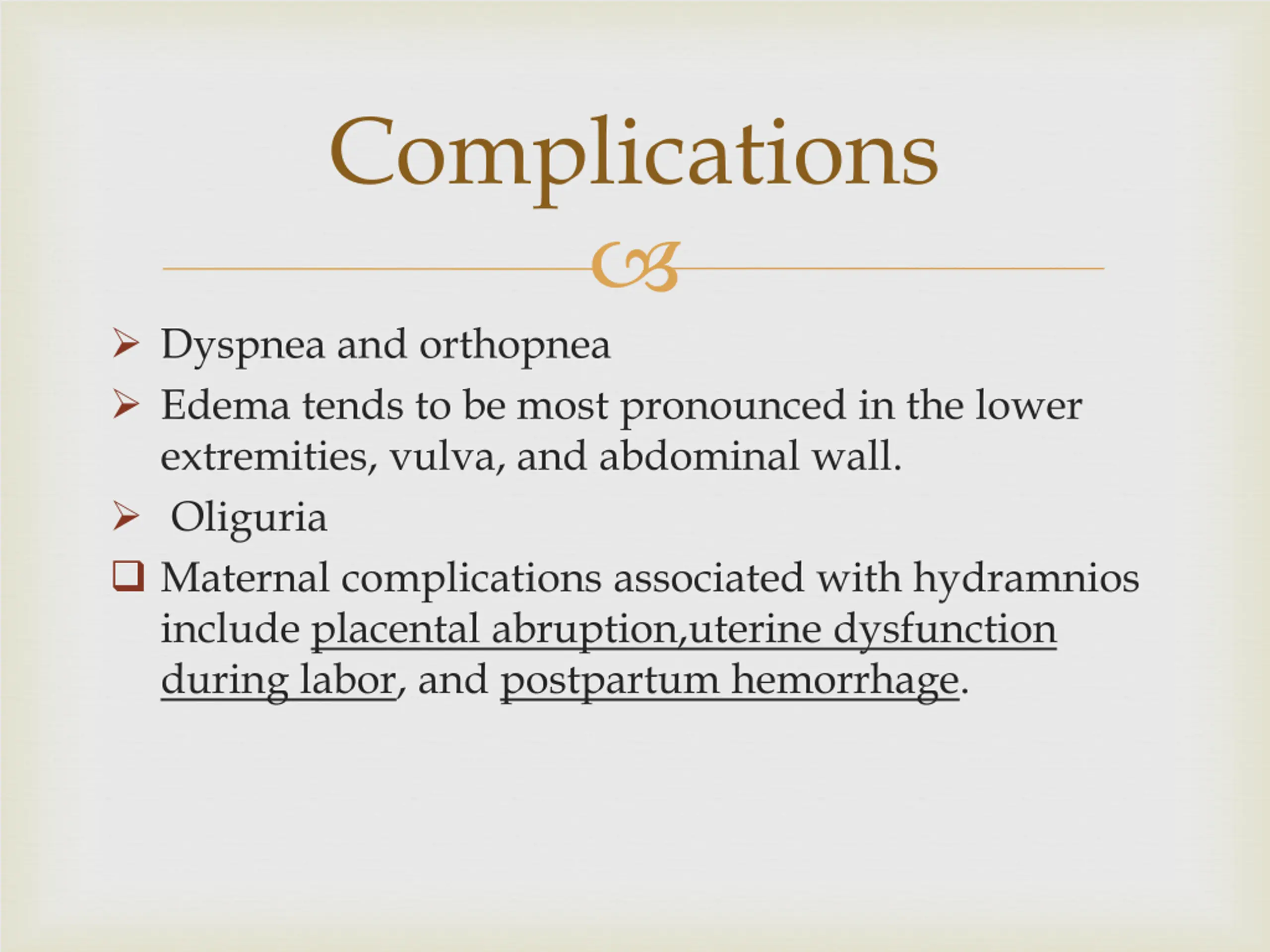 Complications Dyspnea and orthopnea Edema tends to be most pronounced in the lower extremities, vulva, and abdominal wall. Oliguria Maternal complications associated with hydramnios include placental abruption,uterine dysfunction during labor, and postpartum hemorrhage.