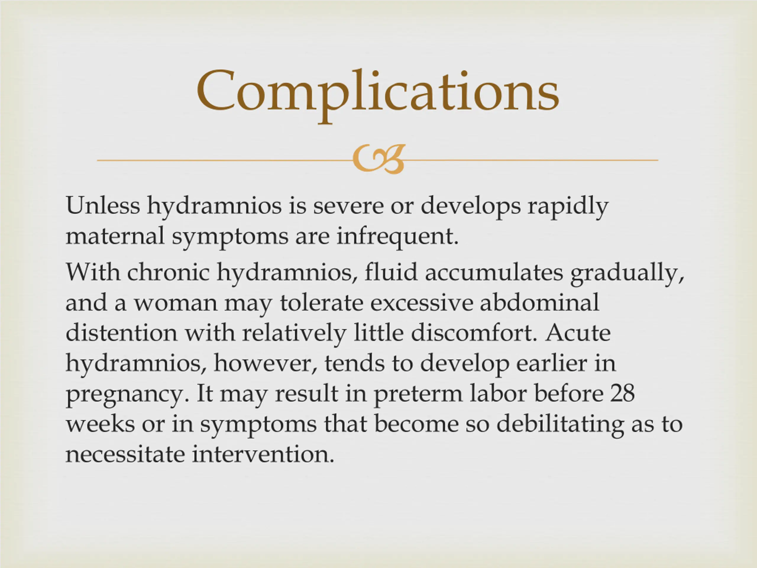Complications Unless hydramnios is severe or develops rapidly maternal symptoms are infrequent. With chronic hydramnios, fluid accumulates gradually, and a woman may tolerate excessive abdominal distention with relatively little discomfort. Acute hydramnios, however, tends to develop earlier in pregnancy. It may result in preterm labor before 28 weeks or in symptoms that become so debilitating as to necessitate intervention.