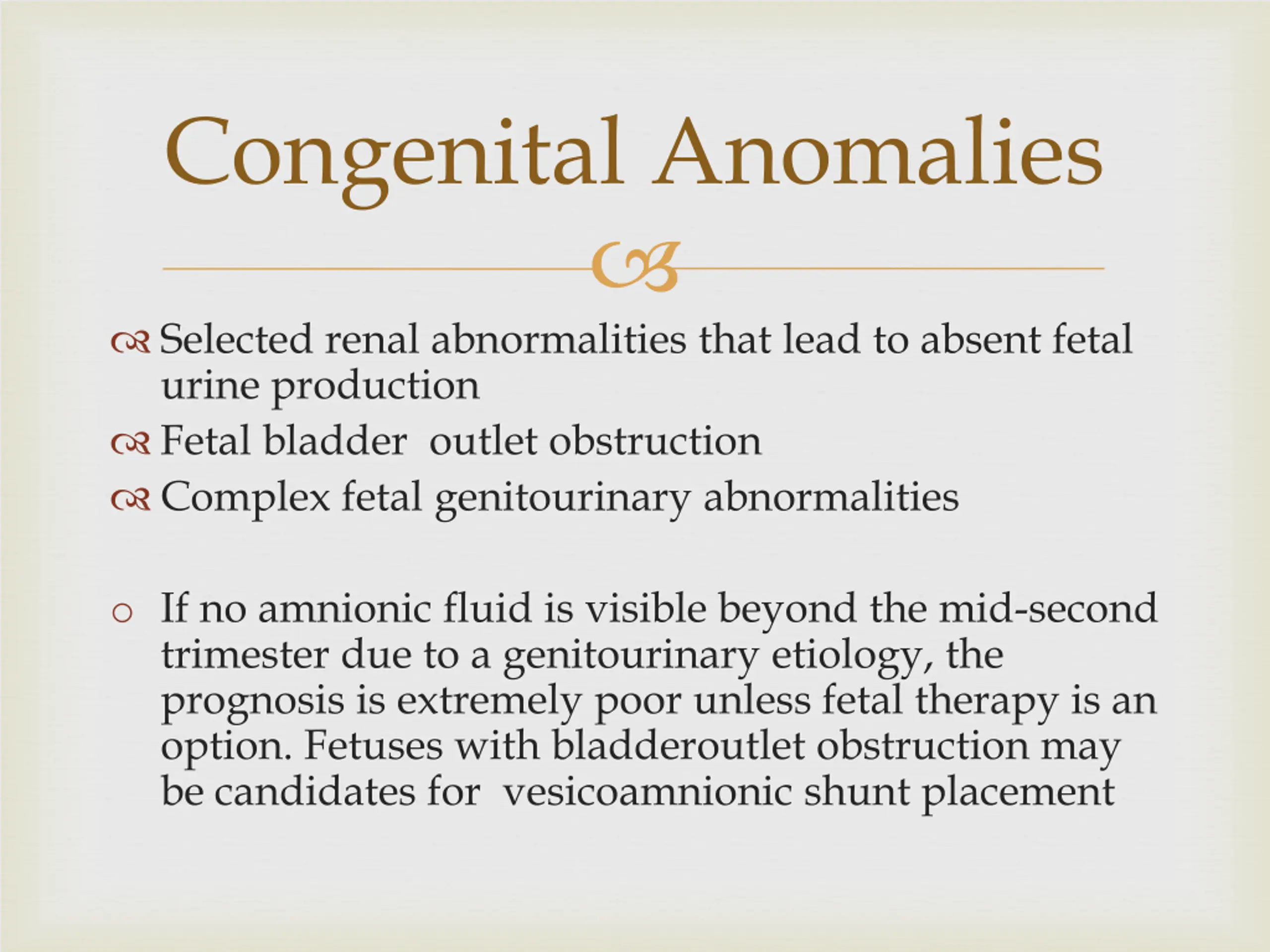 Congenital Anomalies Selected renal abnormalities that lead to absent fetal urine production Fetal bladder outlet obstruction Complex fetal genitourinary abnormalities o If no amnionic fluid is visible beyond the mid-second trimester due to a genitourinary etiology, the prognosis is extremely poor unless fetal therapy is an option. Fetuses with bladderoutlet obstruction may be candidates for vesicoamnionic shunt placement