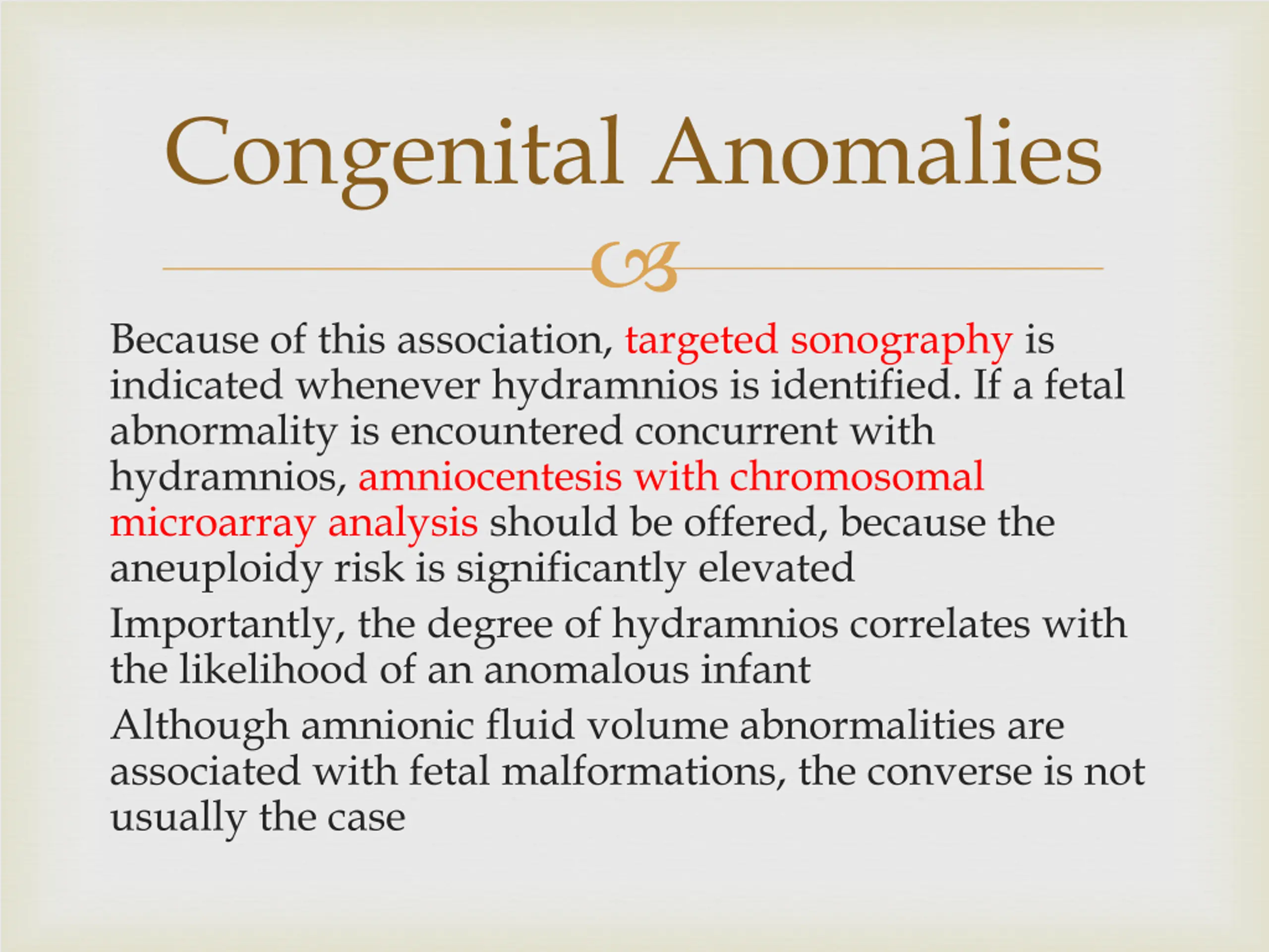 Congenital Anomalies Because of this association, targeted sonography is indicated whenever hydramnios is identified. If a fetal abnormality is encountered concurrent with hydramnios, amniocentesis with chromosomal microarray analysis should be offered, because the aneuploidy risk is significantly elevated Importantly, the degree of hydramnios correlates with the likelihood of an anomalous infant Although amnionic fluid volume abnormalities are associated with fetal malformations, the converse is not usually the case