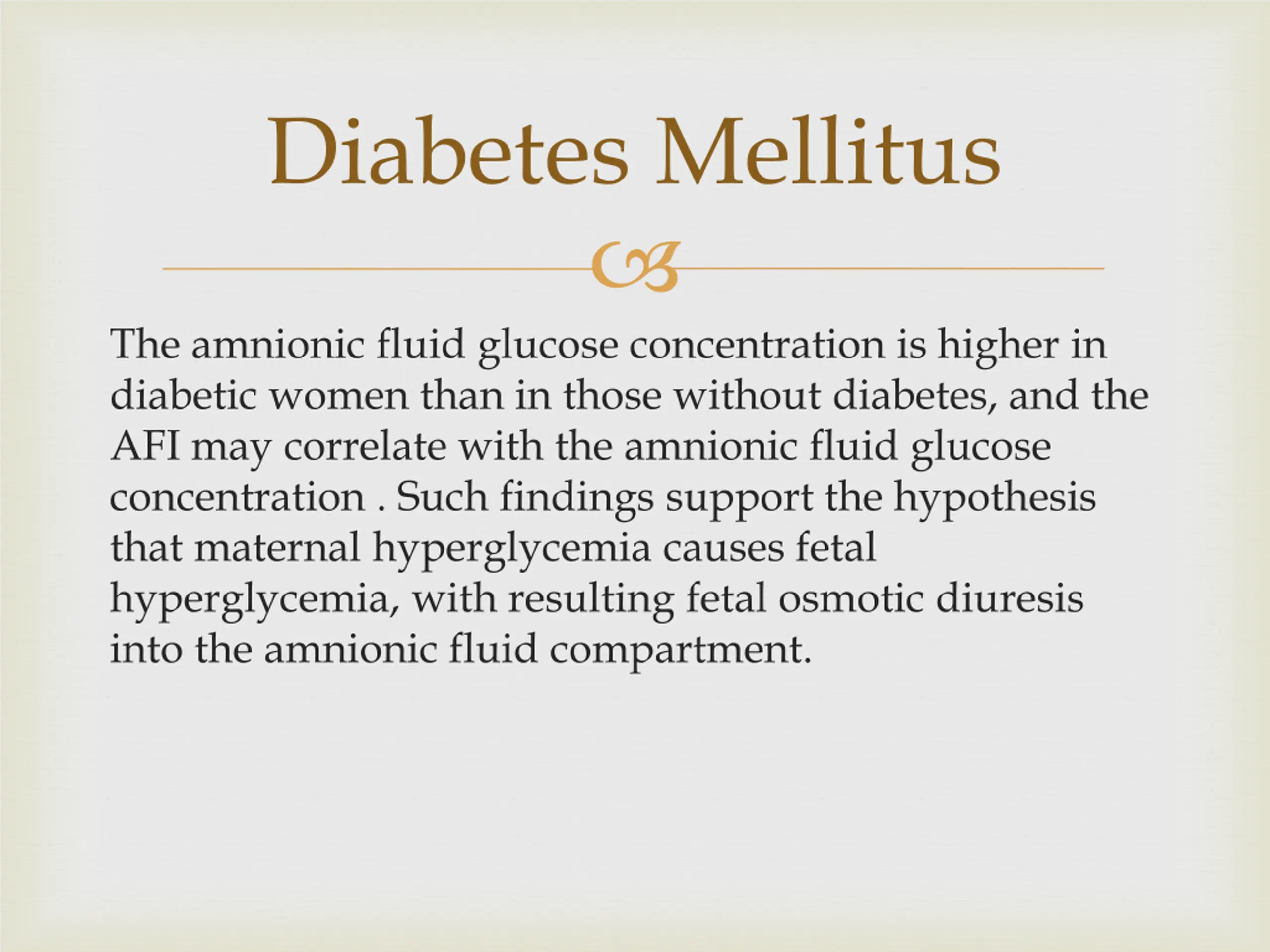 Diabetes Mellitus The amnionic fluid glucose concentration is higher in diabetic women than in those without diabetes, and the AFI may correlate with the amnionic fluid glucose concentration . Such findings support the hypothesis that maternal hyperglycemia causes fetal hyperglycemia, with resulting fetal osmotic diuresis into the amnionic fluid compartment.