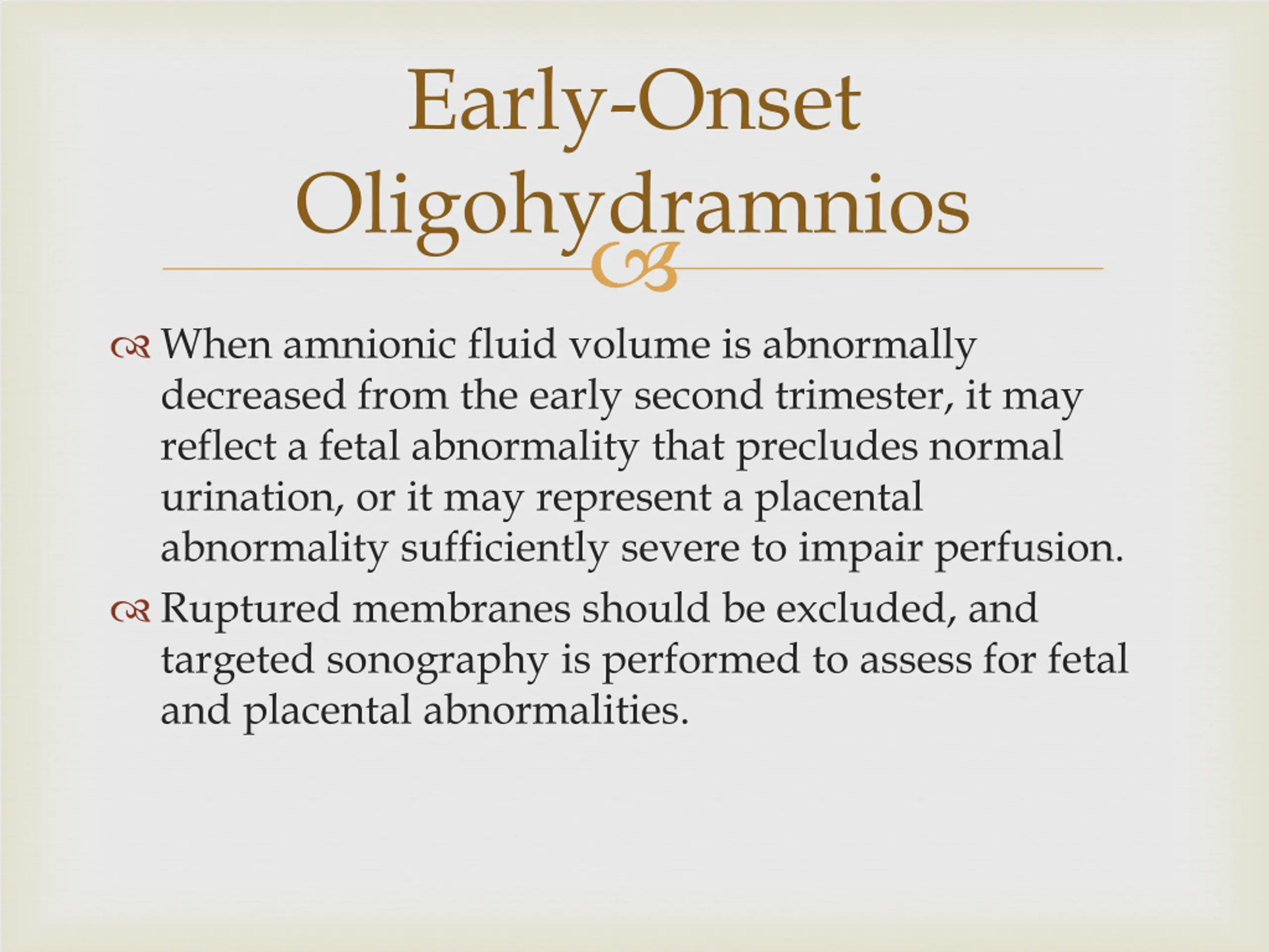 Early-Onset Oligohydramnios When amnionic fluid volume is abnormally decreased from the early second trimester, it may reflect a fetal abnormality that precludes normal urination, or it may represent a placental abnormality sufficiently severe to impair perfusion. Ruptured membranes should be excluded, and targeted sonography is performed to assess for fetal and placental abnormalities.
