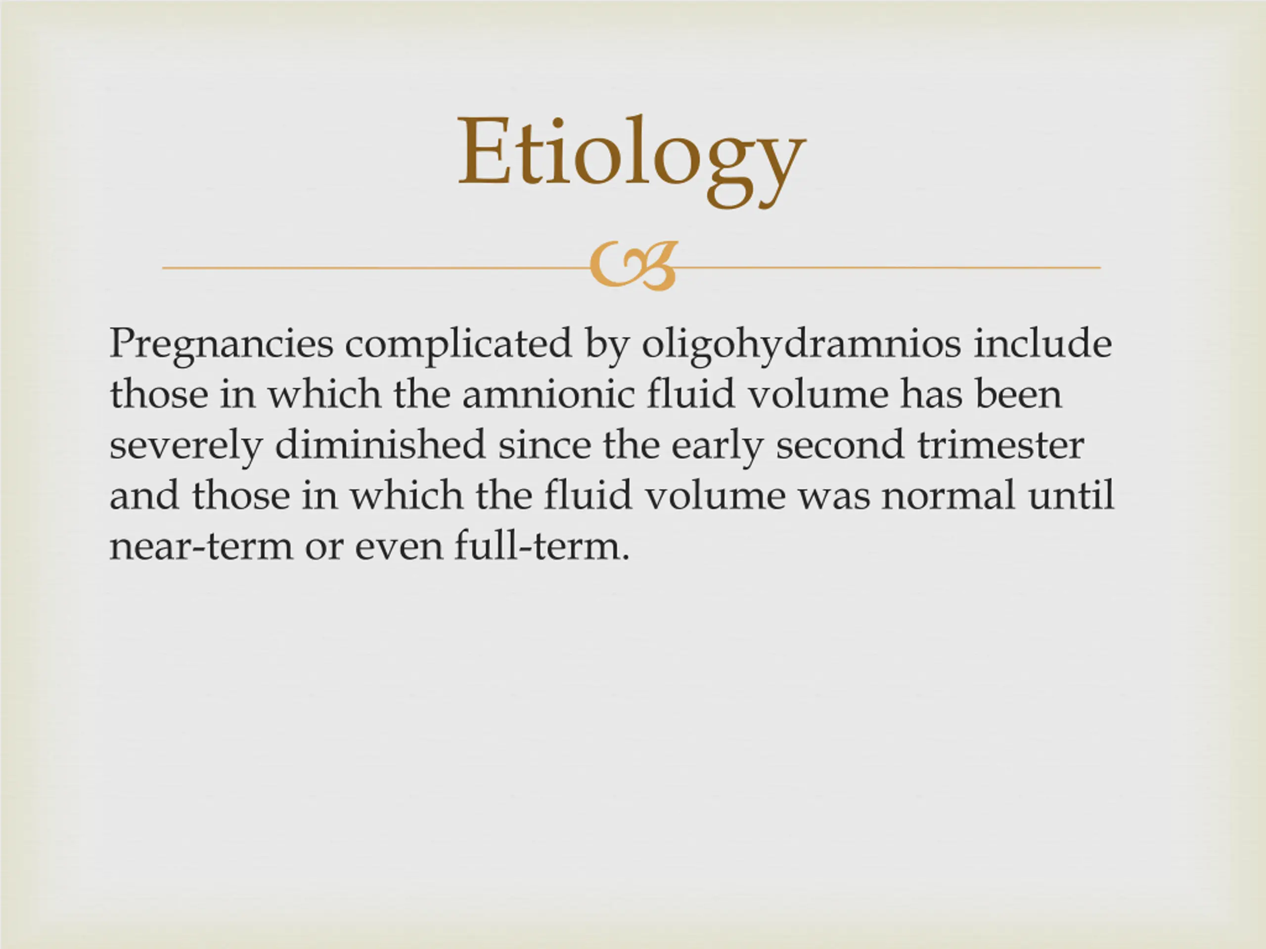 Etiology Pregnancies complicated by oligohydramnios include those in which the amnionic fluid volume has been severely diminished since the early second trimester and those in which the fluid volume was normal until near-term or even full-term.