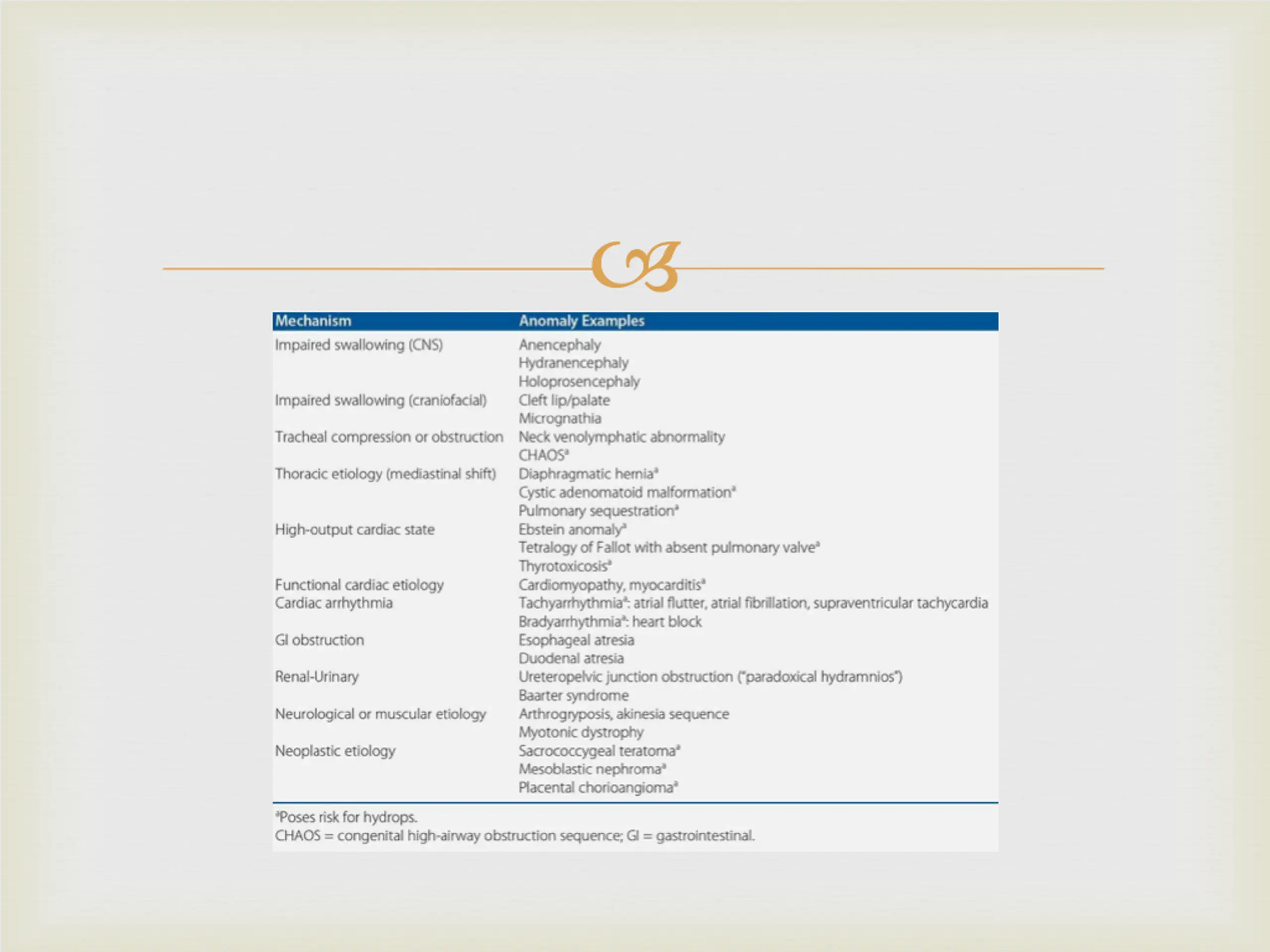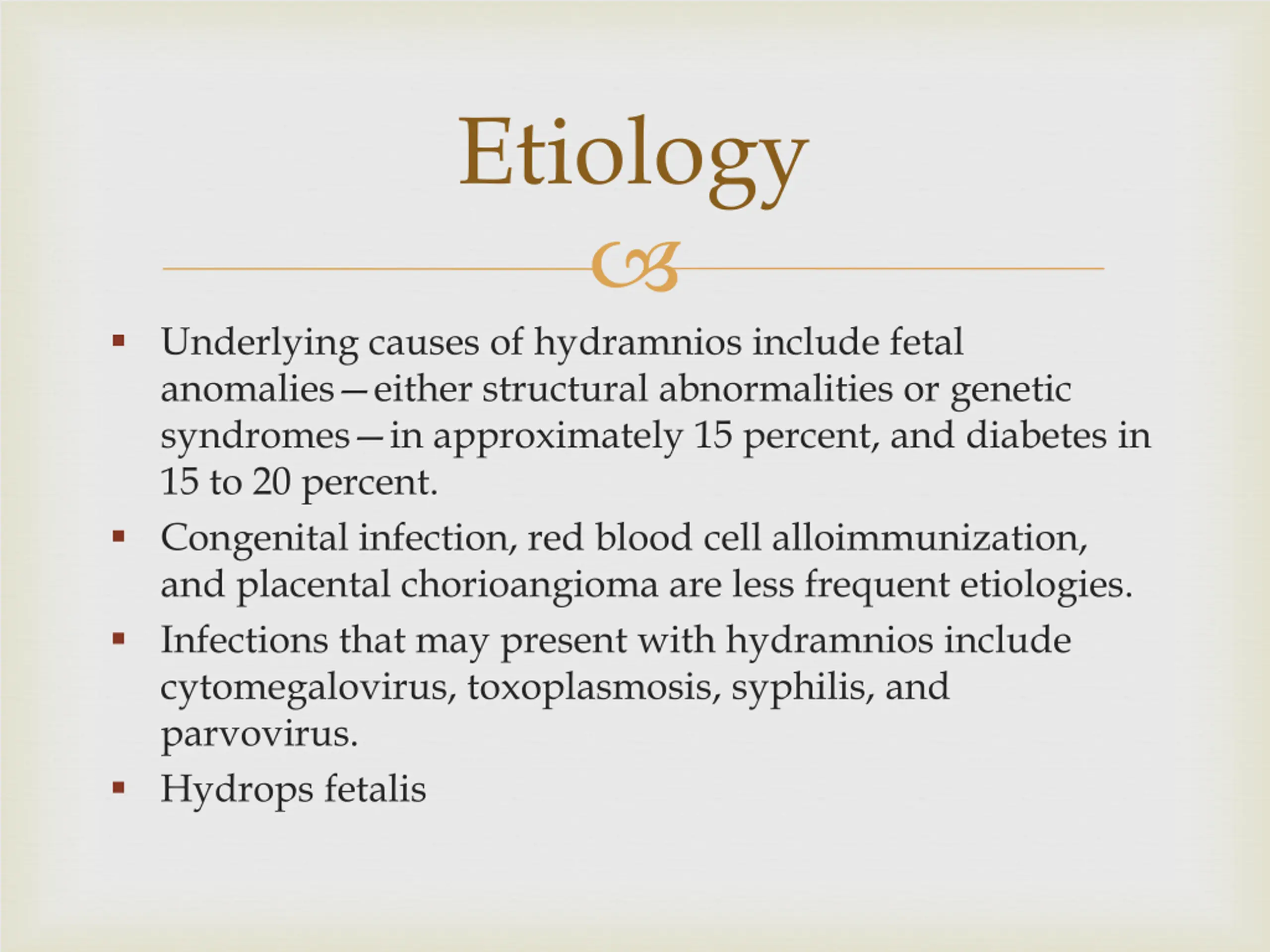 Etiology Underlying causes of hydramnios include fetal anomalies either structural abnormalities or genetic syndromes in approximately 15 percent, and diabetes in 15 to 20 percent. Congenital infection, red blood cell alloimmunization, and placental chorioangioma are less frequent etiologies. Infections that may present with hydramnios include cytomegalovirus, toxoplasmosis, syphilis, and parvovirus. Hydrops fetalis