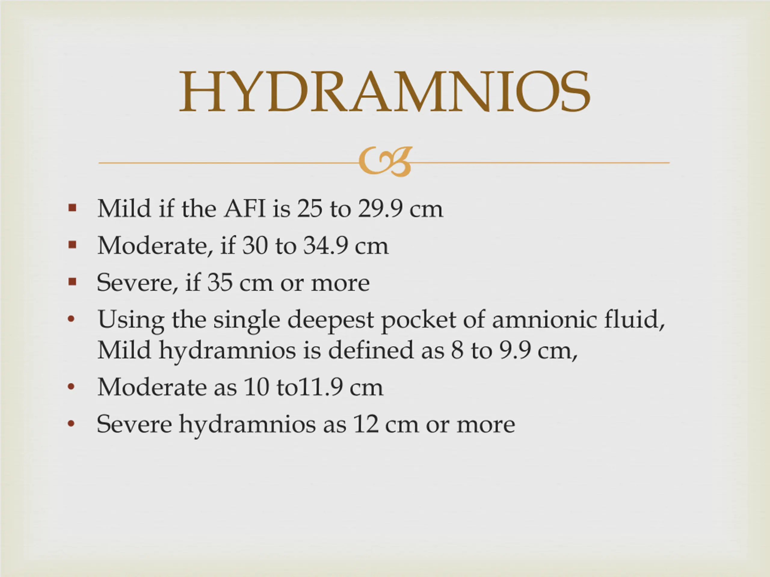 HYDRAMNIOS Mild if the AFI is 25 to 29.9 cm Moderate, if 30 to 34.9 cm Severe, if 35 cm or more Using the single deepest pocket of amnionic fluid, Mild hydramnios is defined as 8 to 9.9 cm, Moderate as 10 to11.9 cm Severe hydramnios as 12 cm or more