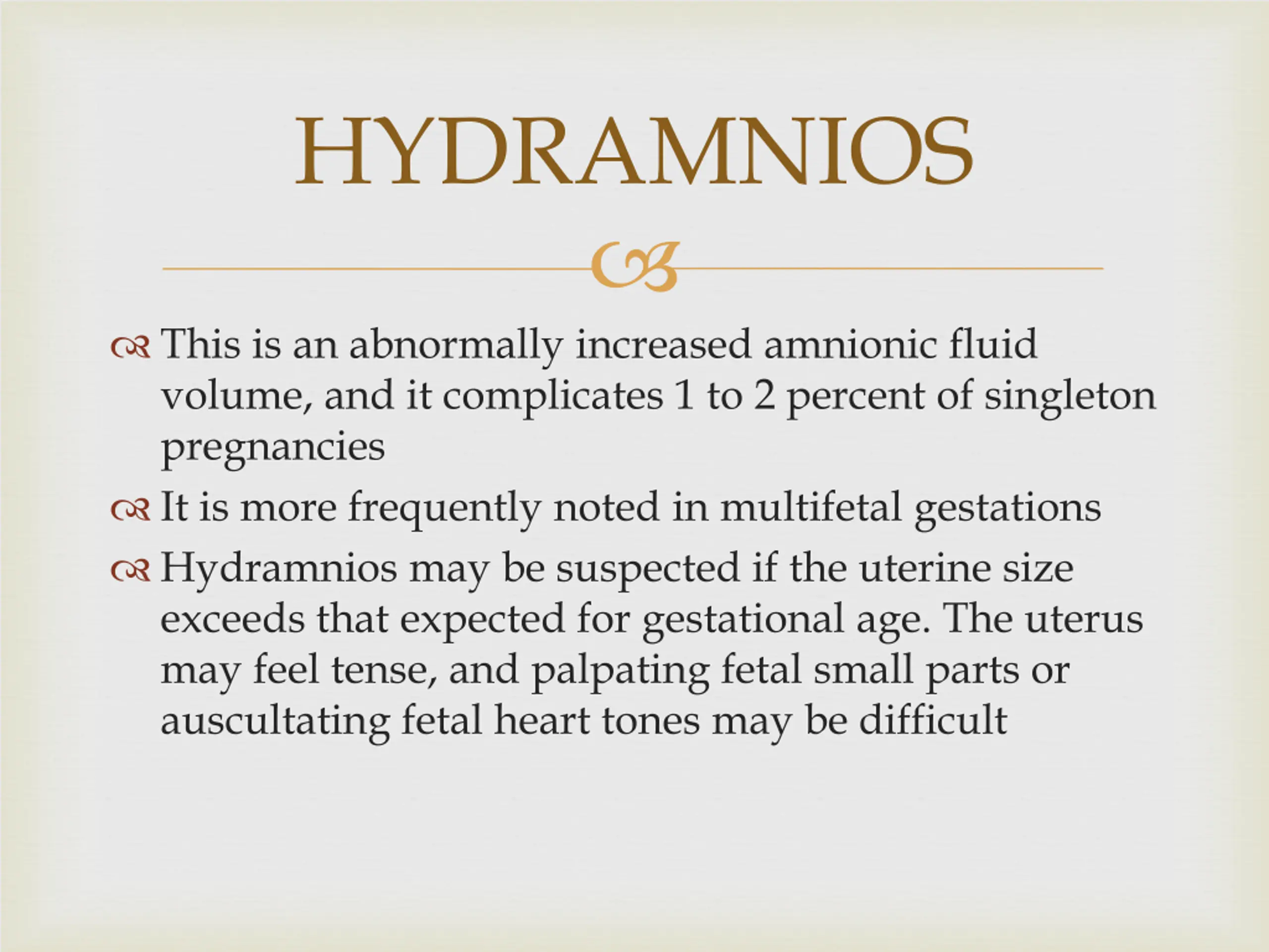 HYDRAMNIOS This is an abnormally increased amnionic fluid volume, and it complicates 1 to 2 percent of singleton pregnancies It is more frequently noted in multifetal gestations Hydramnios may be suspected if the uterine size exceeds that expected for gestational age. The uterus may feel tense, and palpating fetal small parts or auscultating fetal heart tones may be difficult