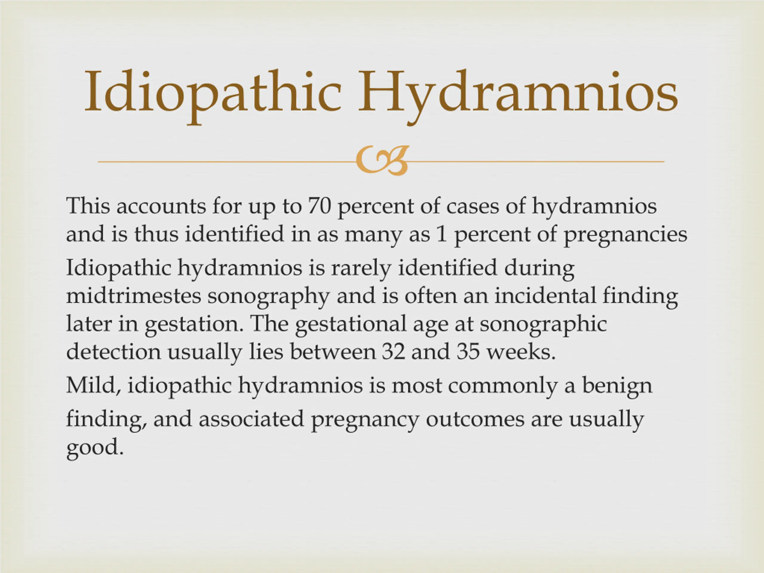 Idiopathic Hydramnios This accounts for up to 70 percent of cases of hydramnios and is thus identified in as many as 1 percent of pregnancies Idiopathic hydramnios is rarely identified during midtrimestes sonography and is often an incidental finding later in gestation. The gestational age at sonographic detection usually lies between 32 and 35 weeks. Mild, idiopathic hydramnios is most commonly a benign finding, and associated pregnancy outcomes are usually good.