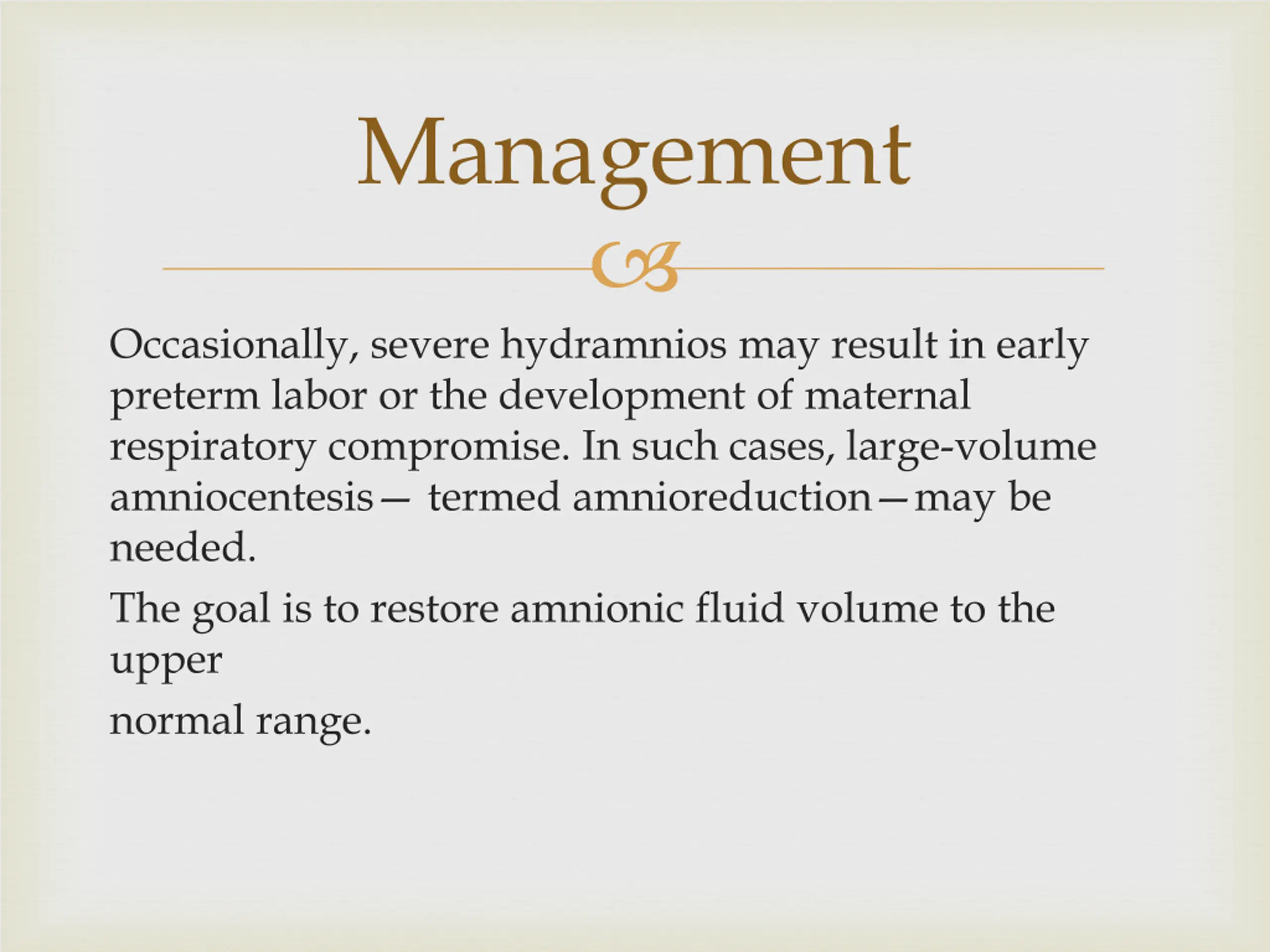 Management Occasionally, severe hydramnios may result in early preterm labor or the development of maternal respiratory compromise. In such cases, large-volume amniocentesis termed amnioreduction may be needed. The goal is to restore amnionic fluid volume to the upper normal range.