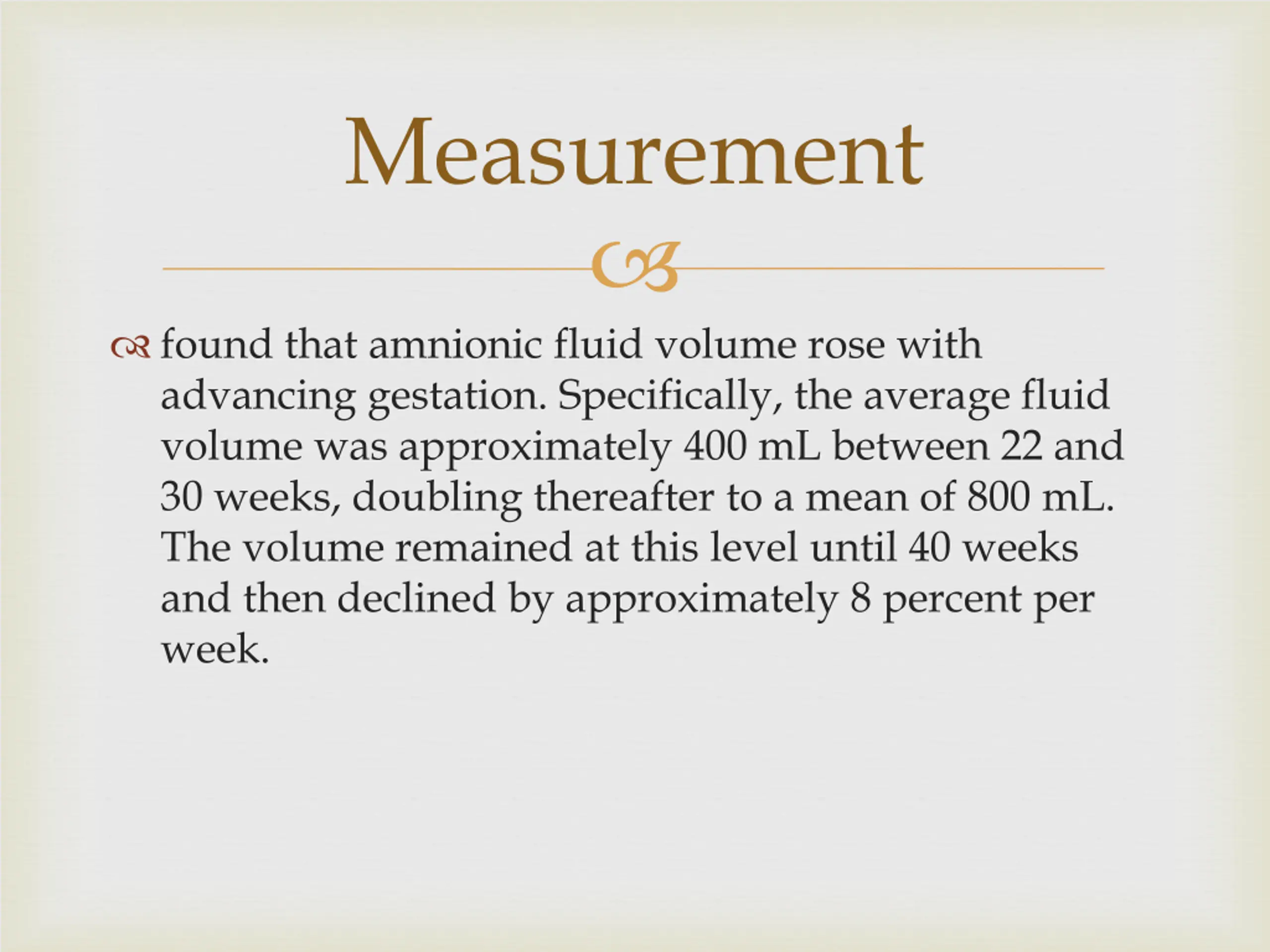 Measurement found that amnionic fluid volume rose with advancing gestation. Specifically, the average fluid volume was approximately 400 mL between 22 and 30 weeks, doubling thereafter to a mean of 800 mL. The volume remained at this level until 40 weeks and then declined by approximately 8 percent per week.