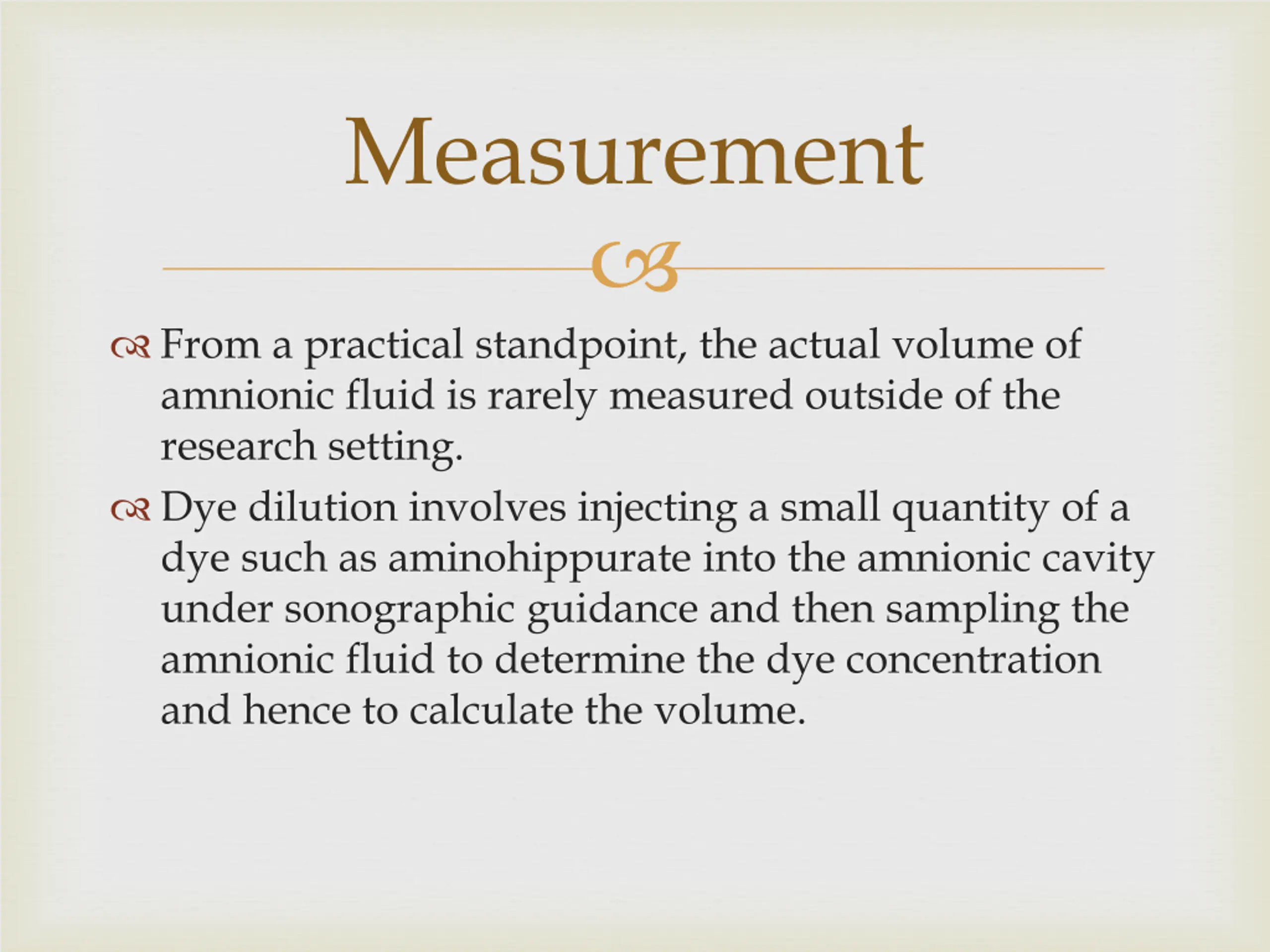 Measurement From a practical standpoint, the actual volume of amnionic fluid is rarely measured outside of the research setting. Dye dilution involves injecting a small quantity of a dye such as aminohippurate into the amnionic cavity under sonographic guidance and then sampling the amnionic fluid to determine the dye concentration and hence to calculate the volume.