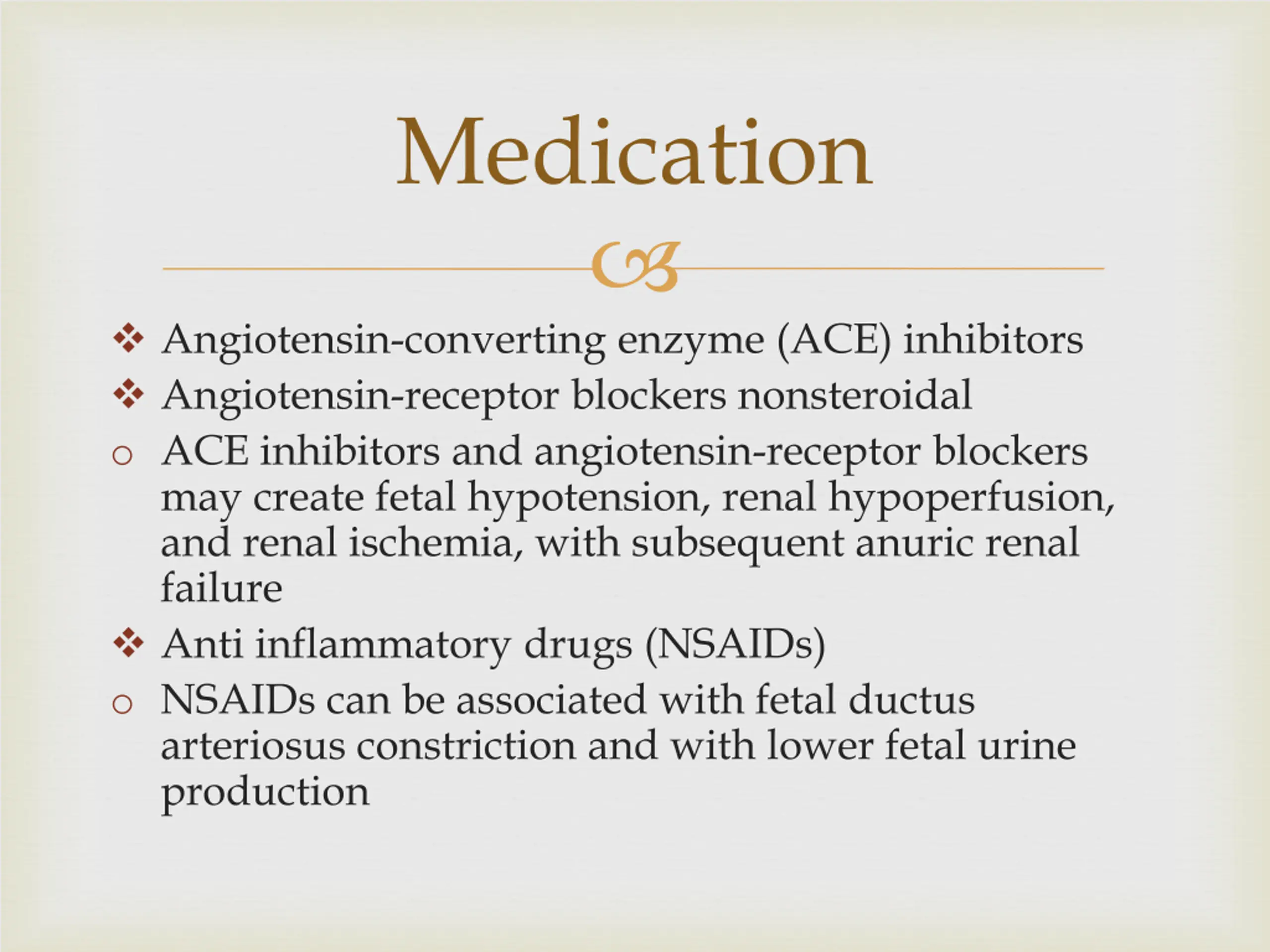Medication Angiotensin-converting enzyme (ACE) inhibitors Angiotensin-receptor blockers nonsteroidal o ACE inhibitors and angiotensin-receptor blockers may create fetal hypotension, renal hypoperfusion, and renal ischemia, with subsequent anuric renal failure Anti inflammatory drugs (NSAIDs) o NSAIDs can be associated with fetal ductus arteriosus constriction and with lower fetal urine production