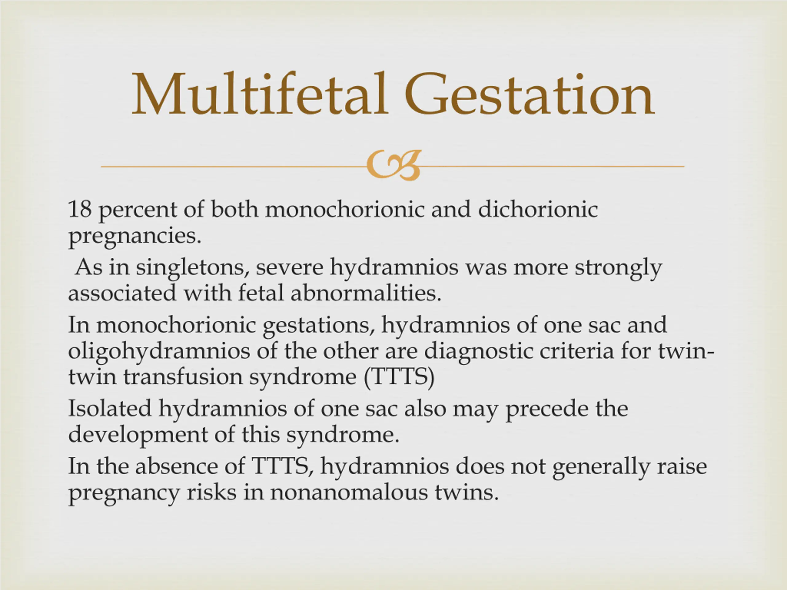 Multifetal Gestation 18 percent of both monochorionic and dichorionic pregnancies. As in singletons, severe hydramnios was more strongly associated with fetal abnormalities. In monochorionic gestations, hydramnios of one sac and oligohydramnios of the other are diagnostic criteria for twin- twin transfusion syndrome (TTTS) Isolated hydramnios of one sac also may precede the development of this syndrome. In the absence of TTTS, hydramnios does not generally raise pregnancy risks in nonanomalous twins.