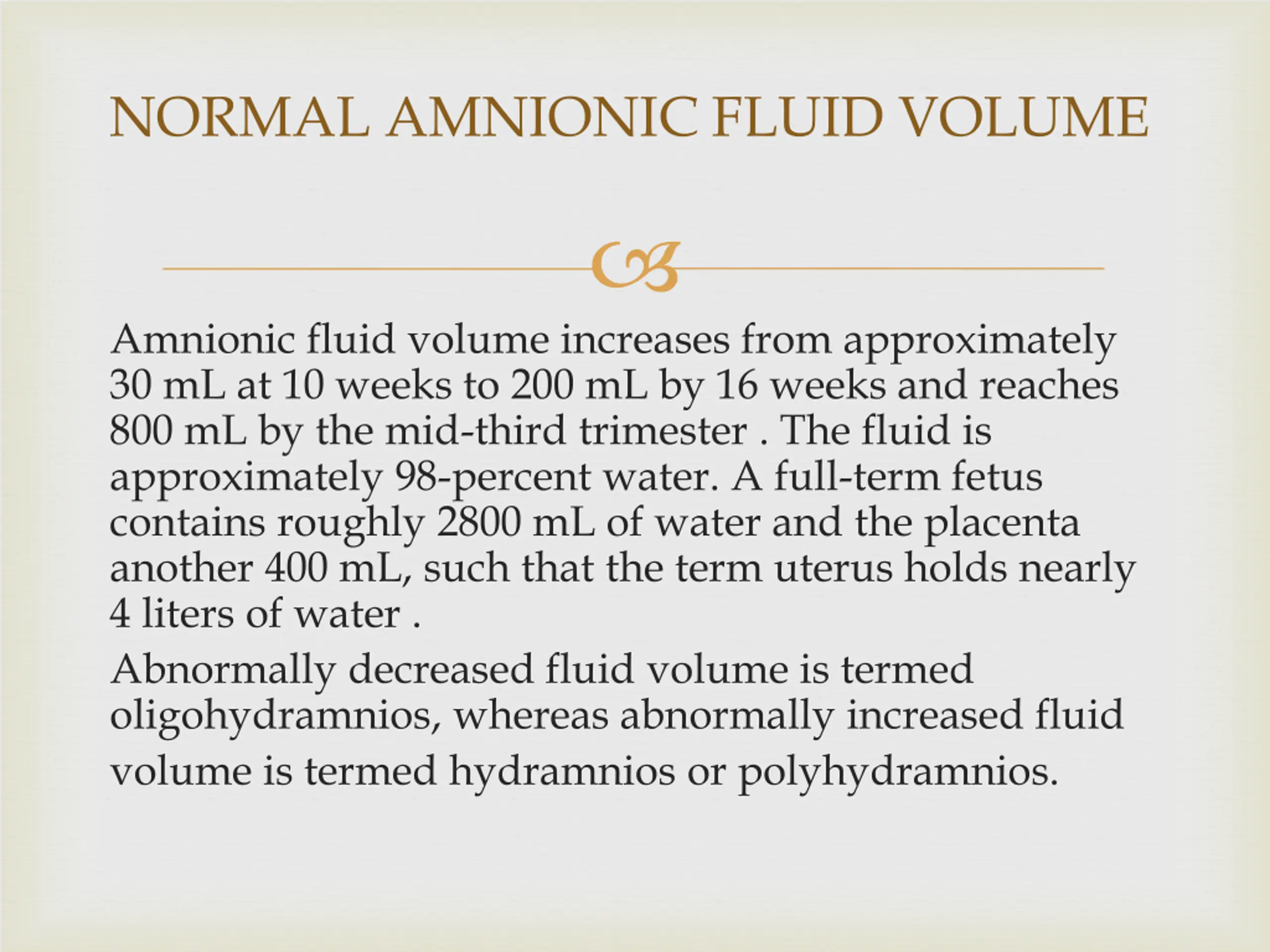 NORMAL AMNIONIC FLUID VOLUME Amnionic fluid volume increases from approximately 30 mL at 10 weeks to 200 mL by 16 weeks and reaches 800 mL by the mid-third trimester . The fluid is approximately 98-percent water. A full-term fetus contains roughly 2800 mL of water and the placenta another 400 mL, such that the term uterus holds nearly 4 liters of water . Abnormally decreased fluid volume is termed oligohydramnios, whereas abnormally increased fluid volume is termed hydramnios or polyhydramnios.