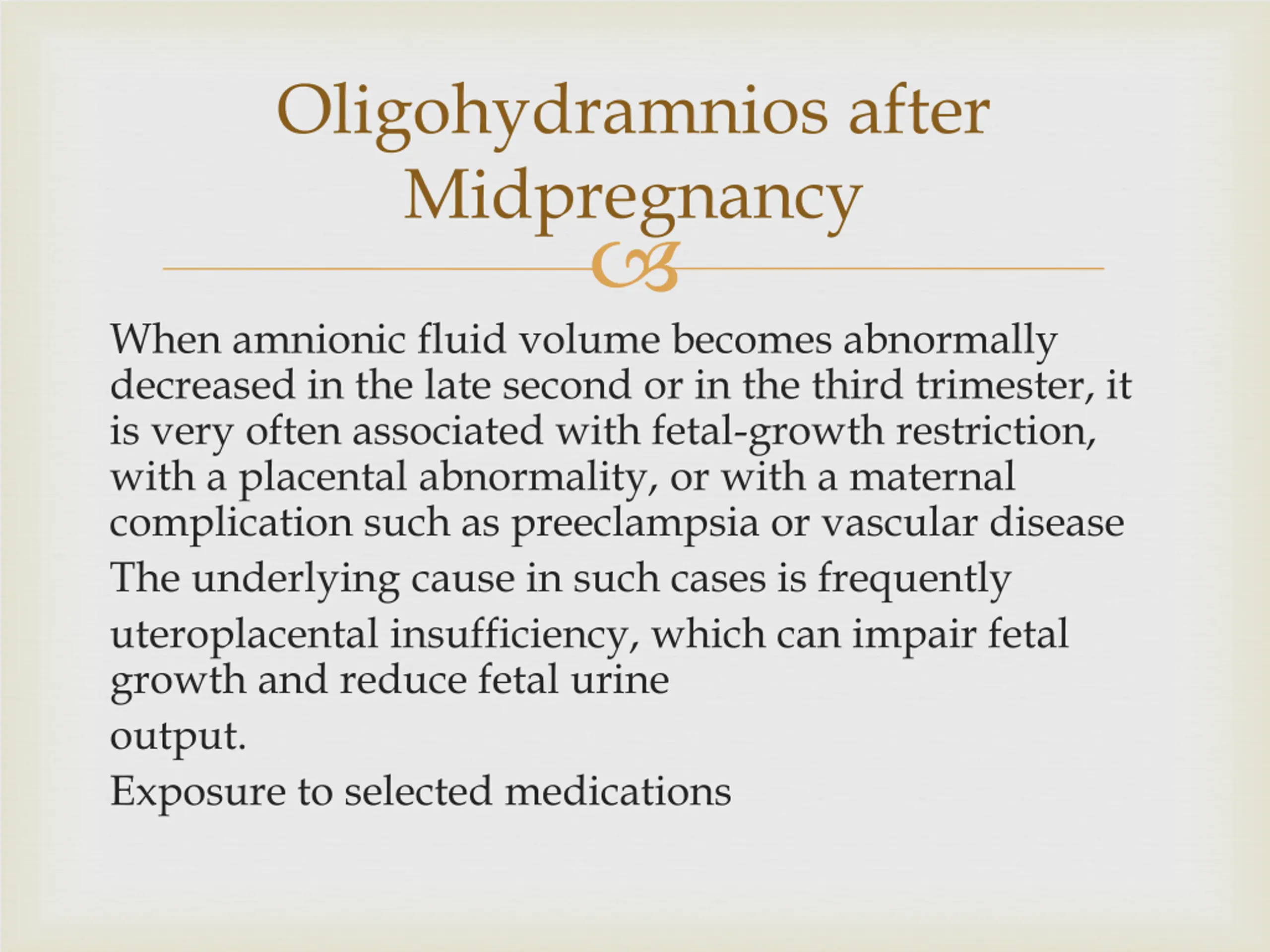 Oligohydramnios after Midpregnancy When amnionic fluid volume becomes abnormally decreased in the late second or in the third trimester, it is very often associated with fetal-growth restriction, with a placental abnormality, or with a maternal complication such as preeclampsia or vascular disease The underlying cause in such cases is frequently uteroplacental insufficiency, which can impair fetal growth and reduce fetal urine output. Exposure to selected medications