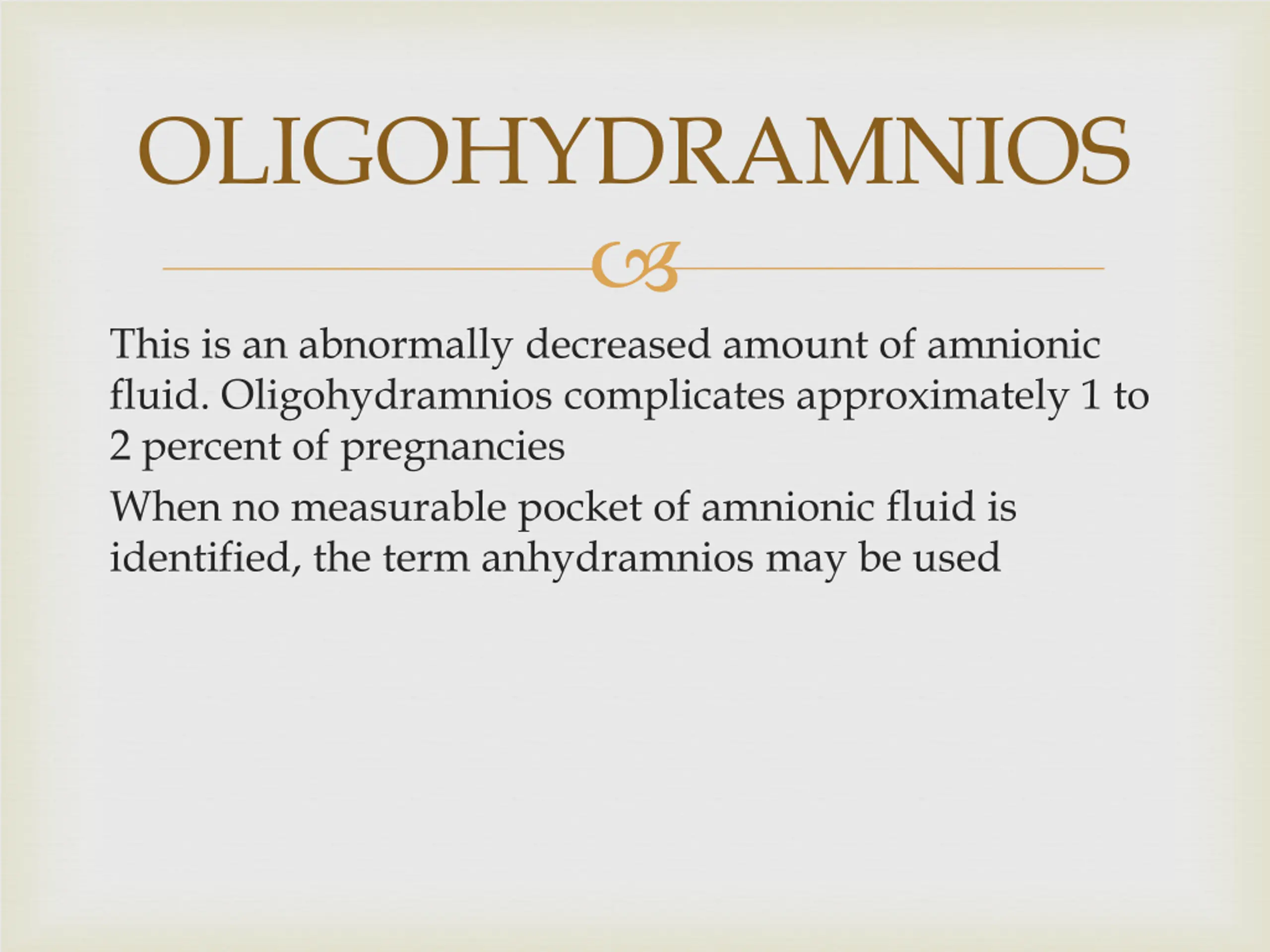 OLIGOHYDRAMNIOS This is an abnormally decreased amount of amnionic fluid. Oligohydramnios complicates approximately 1 to 2 percent of pregnancies When no measurable pocket of amnionic fluid is identified, the term anhydramnios may be used