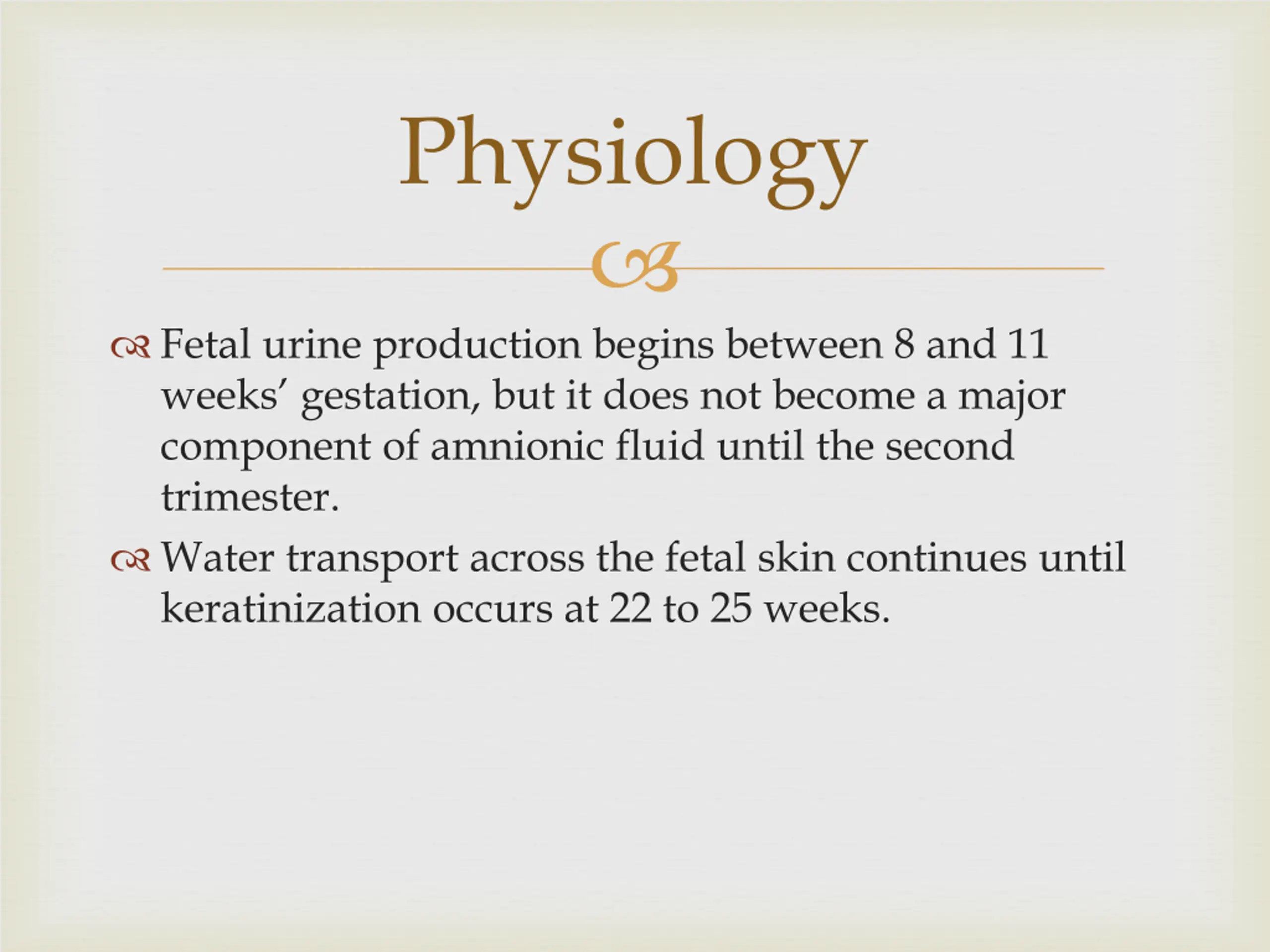Physiology Fetal urine production begins between 8 and 11 weeks gestation, but it does not become a major component of amnionic fluid until the second trimester. Water transport across the fetal skin continues until keratinization occurs at 22 to 25 weeks.