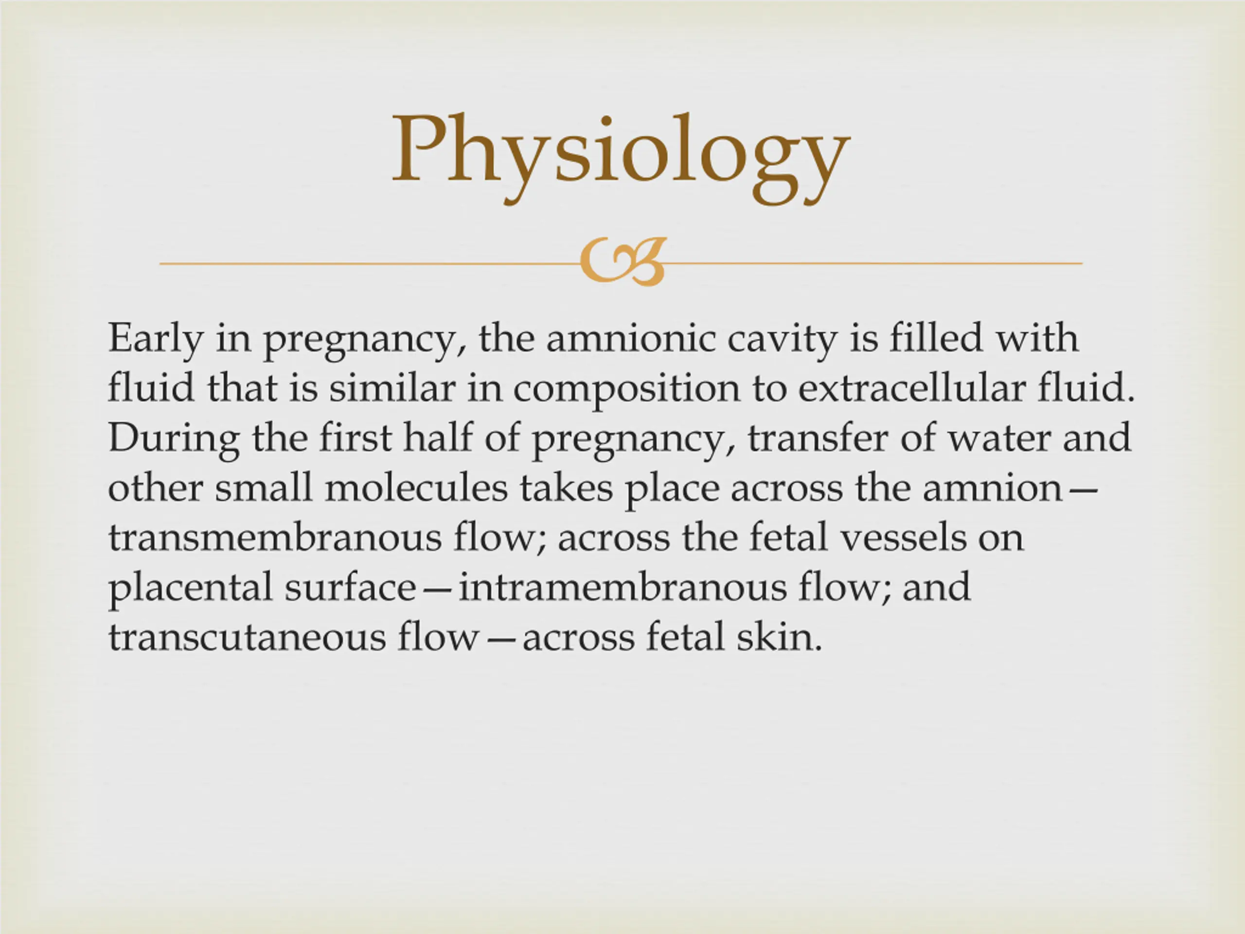Physiology Early in pregnancy, the amnionic cavity is filled with fluid that is similar in composition to extracellular fluid. During the first half of pregnancy, transfer of water and other small molecules takes place across the amnion transmembranous flow; across the fetal vessels on placental surface intramembranous flow; and transcutaneous flow across fetal skin.