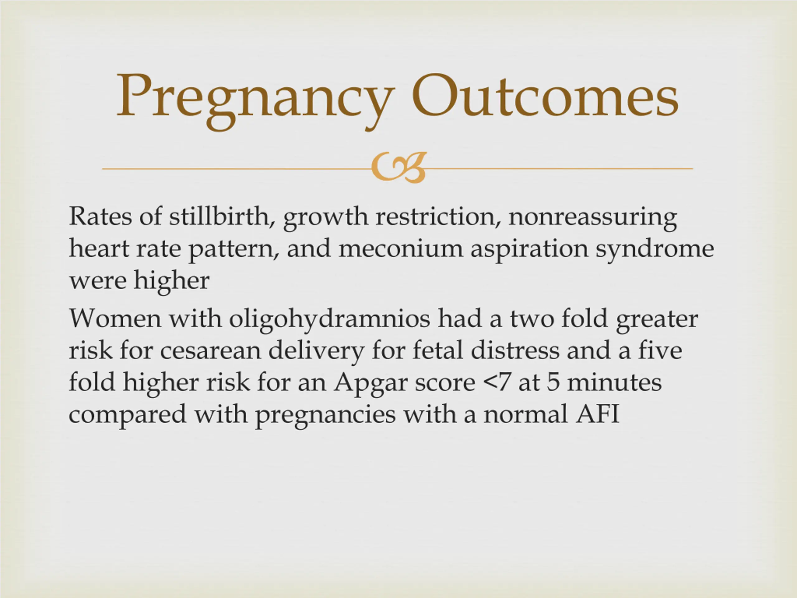 Pregnancy Outcomes Rates of stillbirth, growth restriction, nonreassuring heart rate pattern, and meconium aspiration syndrome were higher Women with oligohydramnios had a two fold greater risk for cesarean delivery for fetal distress and a five fold higher risk for an Apgar score <7 at 5 minutes compared with pregnancies with a normal AFI