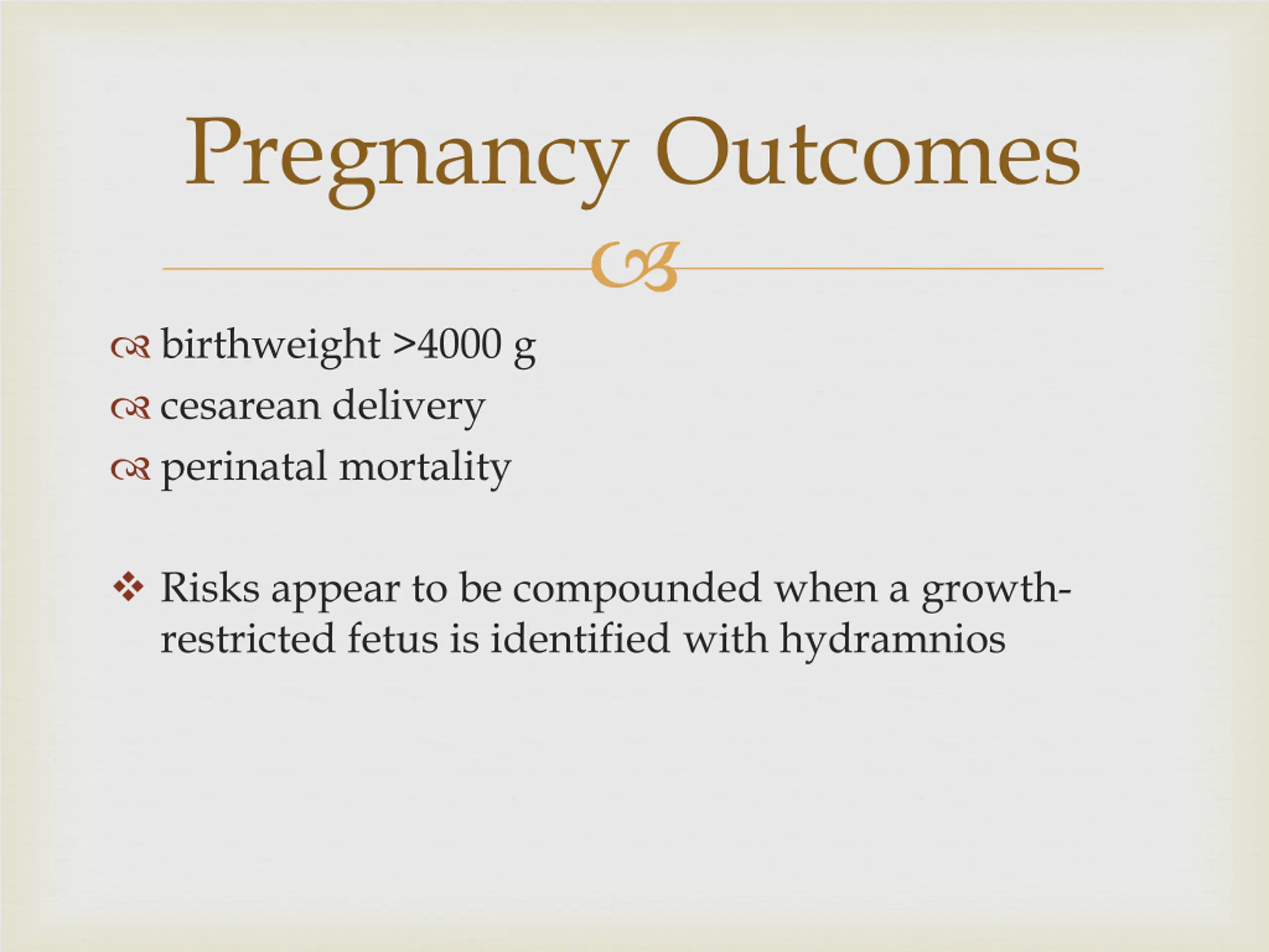 Pregnancy Outcomes birthweight >4000 g cesarean delivery perinatal mortality Risks appear to be compounded when a growth- restricted fetus is identified with hydramnios
