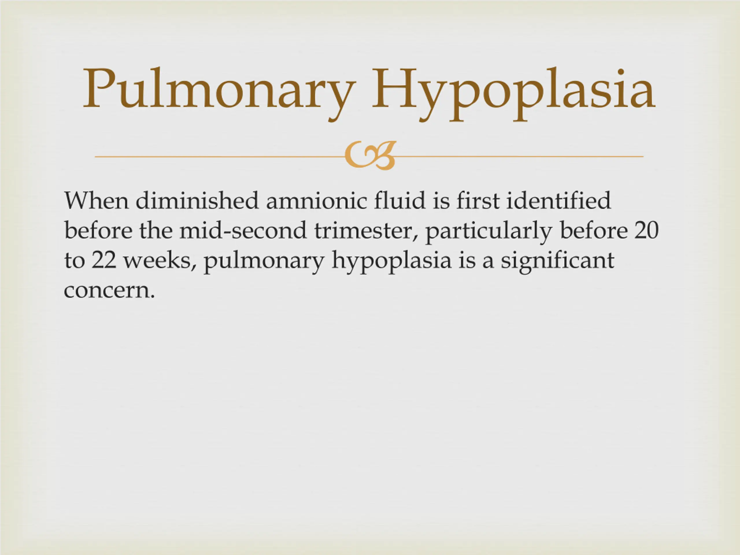 Pulmonary Hypoplasia When diminished amnionic fluid is first identified before the mid-second trimester, particularly before 20 to 22 weeks, pulmonary hypoplasia is a significant concern.
