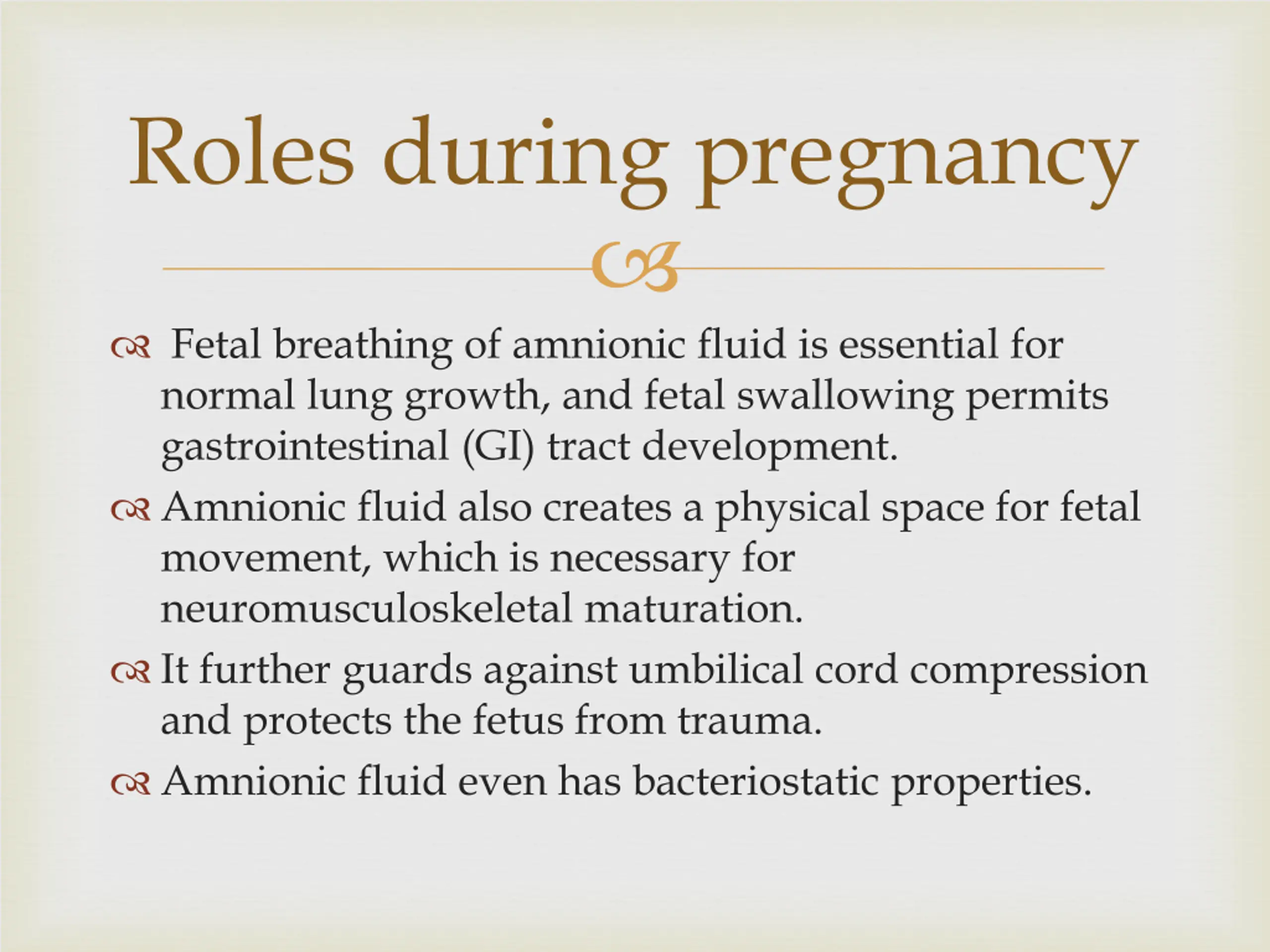 Roles during pregnancy Fetal breathing of amnionic fluid is essential for normal lung growth, and fetal swallowing permits gastrointestinal (GI) tract development. Amnionic fluid also creates a physical space for fetal movement, which is necessary for neuromusculoskeletal maturation. It further guards against umbilical cord compression and protects the fetus from trauma. Amnionic fluid even has bacteriostatic properties.