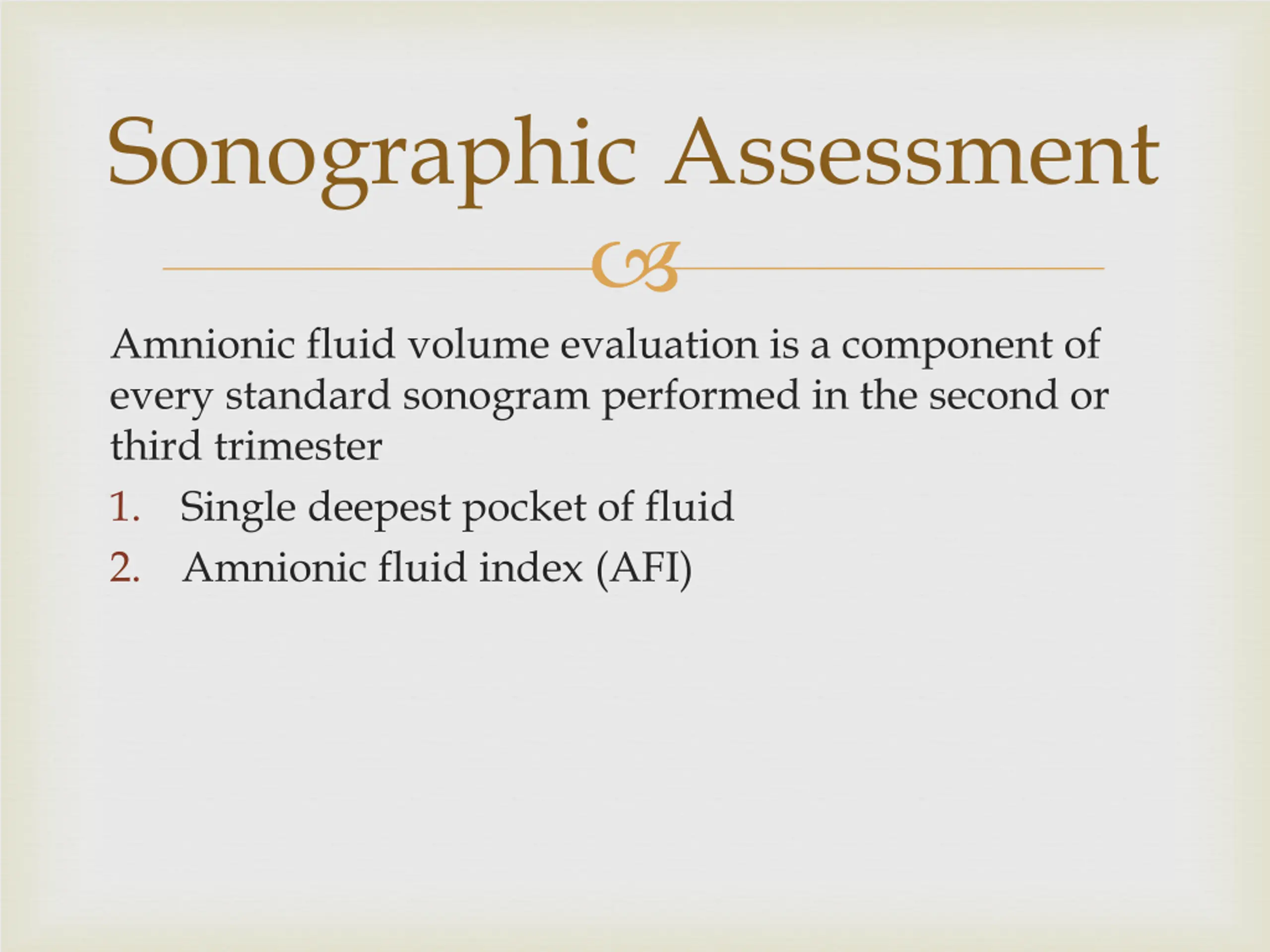 Sonographic Assessment Amnionic fluid volume evaluation is a component of every standard sonogram performed in the second or third trimester 1. Single deepest pocket of fluid 2. Amnionic fluid index (AFI)