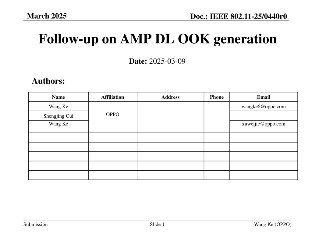 Doc.: IEEE 802.11-25/0440r0 March 2025 Abstract In this contribution, the OOK generation for AMP DL will be further discussed. The advantage of DSSS OOK will be discussed while considering requirements for AMP DL control portion and AMP excitation portion. Submission Slide 2 Wang Ke (OPPO)