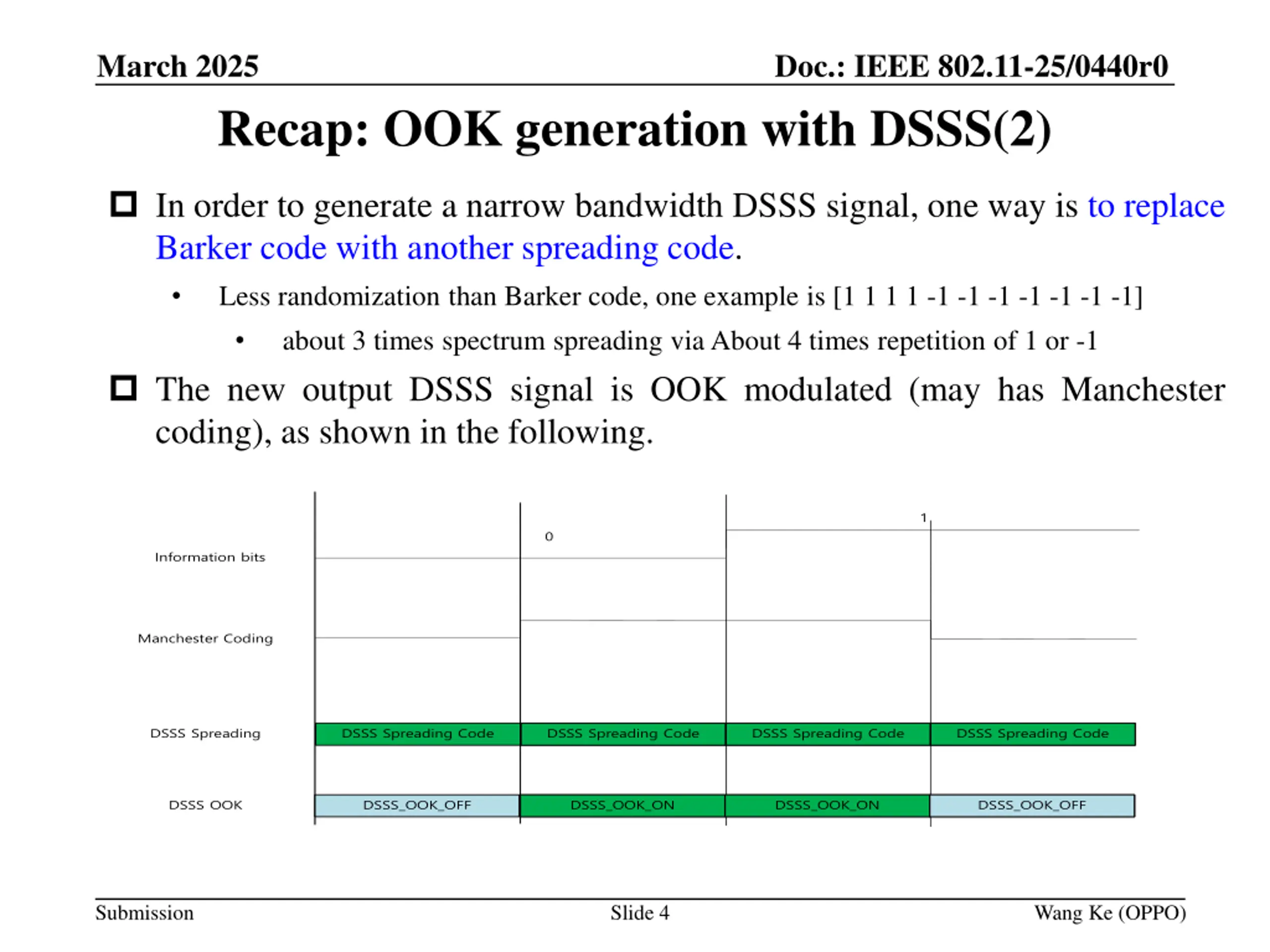 Doc.: IEEE 802.11-25/0440r0 March 2025 Recap:OOK generation with DSSS(1) In 802.11b, Barker code (1,-1,1,1,-1,+1,+1,+1,-1,-1,-1) is used to spread information bits to a wideband DSSS signal with 22MHz spectrum. 0 1 Information bits Barker Code DSSS signal Submission Slide 3 Wang Ke (OPPO)