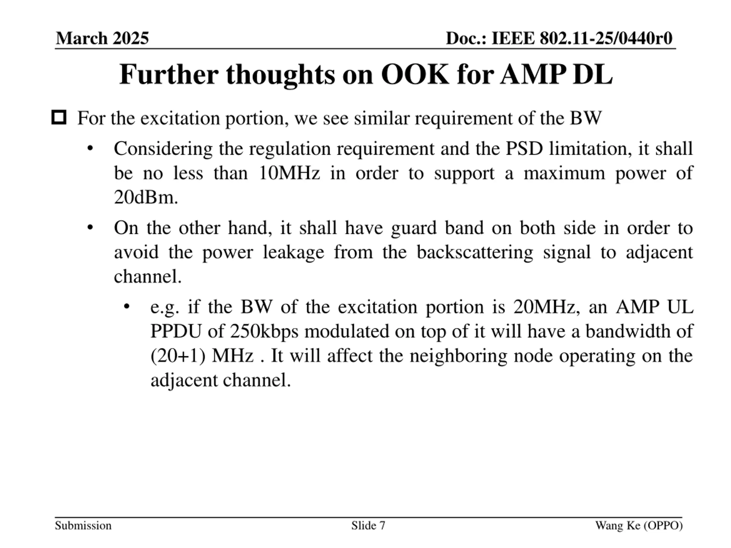 Doc.: IEEE 802.11-25/0440r0 March 2025 Further thoughts on OOK for AMP DL For the excitation portion, we see similar requirement of the BW Considering the regulation requirement and the PSD limitation, it shall be no less than 10MHz in order to support a maximum power of 20dBm. On the other hand, it shall have guard band on both side in order to avoid the power leakage from the backscattering signal to adjacent channel. e.g. if the BW of the excitation portion is 20MHz, an AMP UL PPDU of 250kbps modulated on top of it will have a bandwidth of (20+1) MHz . It will affect the neighboring node operating on the adjacent channel. Submission Slide 7 Wang Ke (OPPO)