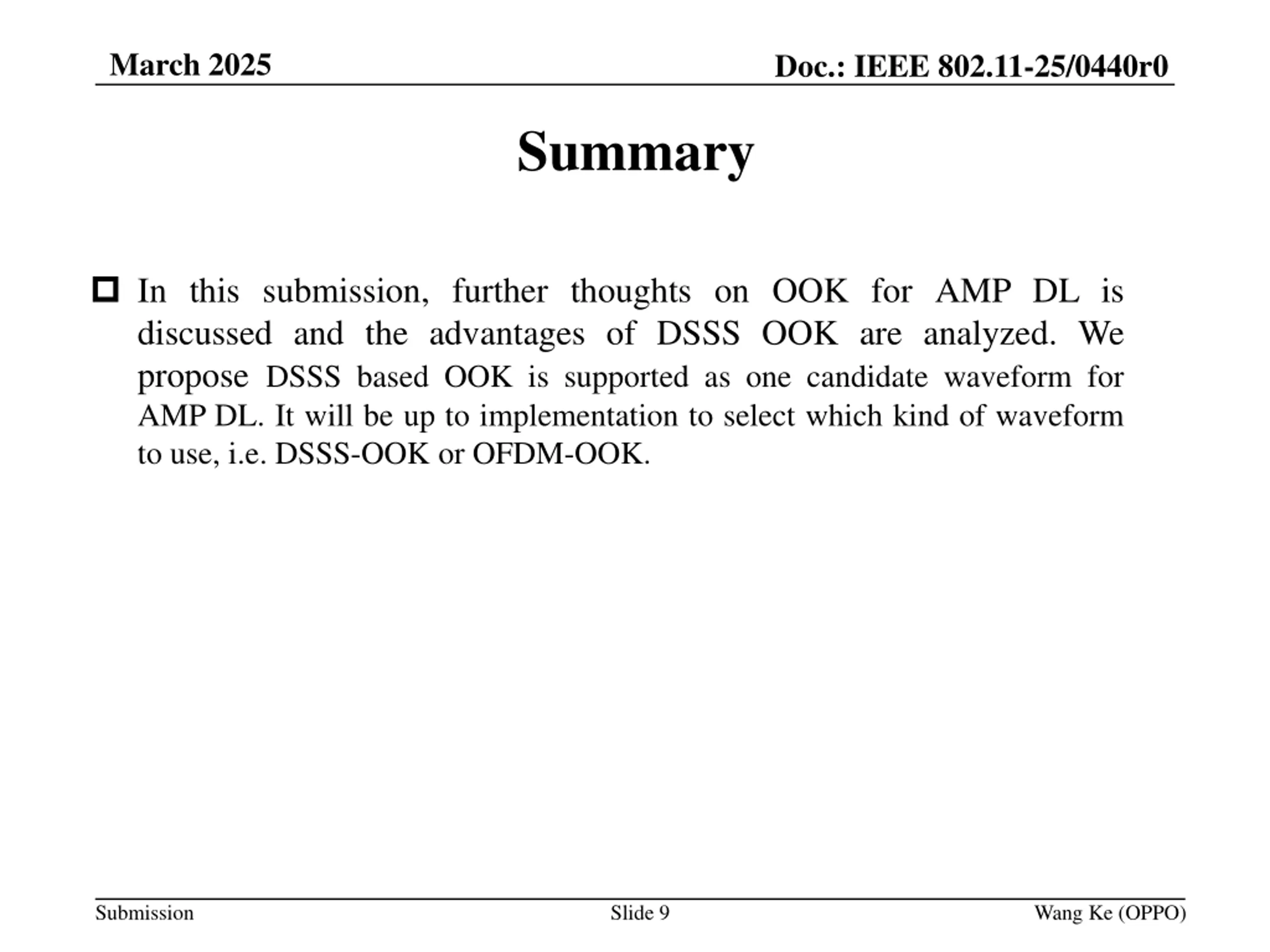 March 2025 Doc.: IEEE 802.11-25/0440r0 Summary In this submission, further thoughts on OOK for AMP DL is discussed and the advantages of DSSS OOK are analyzed. We propose DSSS based OOK is supported as one candidate waveform for AMP DL. It will be up to implementation to select which kind of waveform to use, i.e. DSSS-OOK or OFDM-OOK. Submission Slide 9 Wang Ke (OPPO)