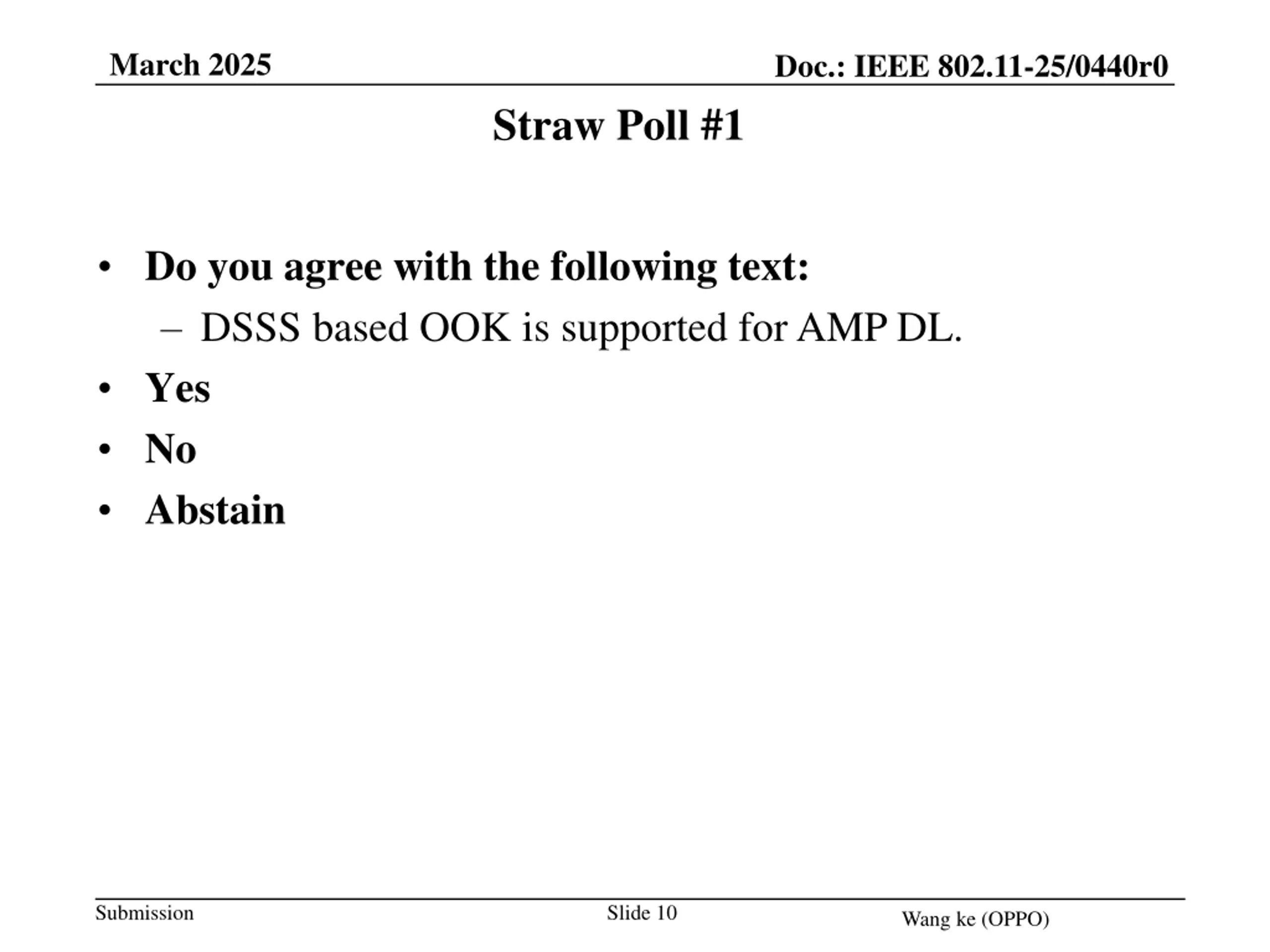 March 2025 Doc.: IEEE 802.11-25/0440r0 Straw Poll #1 Do you agree with the following text: DSSS based OOK is supported for AMP DL. Yes No Abstain Submission Slide 10 Wang ke (OPPO)