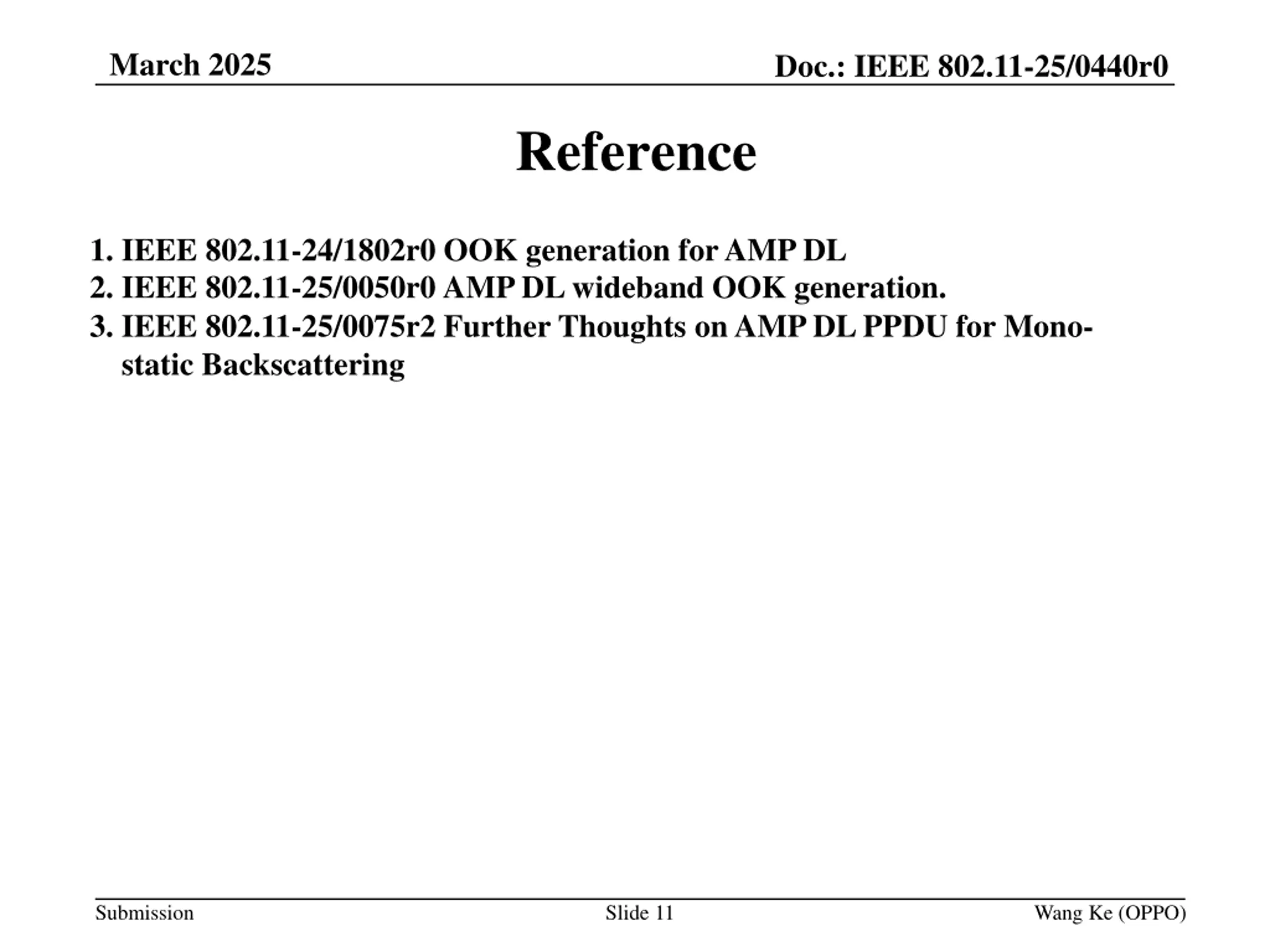 March 2025 Doc.: IEEE 802.11-25/0440r0 Reference 1. IEEE 802.11-24/1802r0 OOK generation for AMP DL 2. IEEE 802.11-25/0050r0AMP DL wideband OOK generation. 3. IEEE 802.11-25/0075r2 Further Thoughts on AMP DL PPDU for Mono- static Backscattering Submission Slide 11 Wang Ke (OPPO)