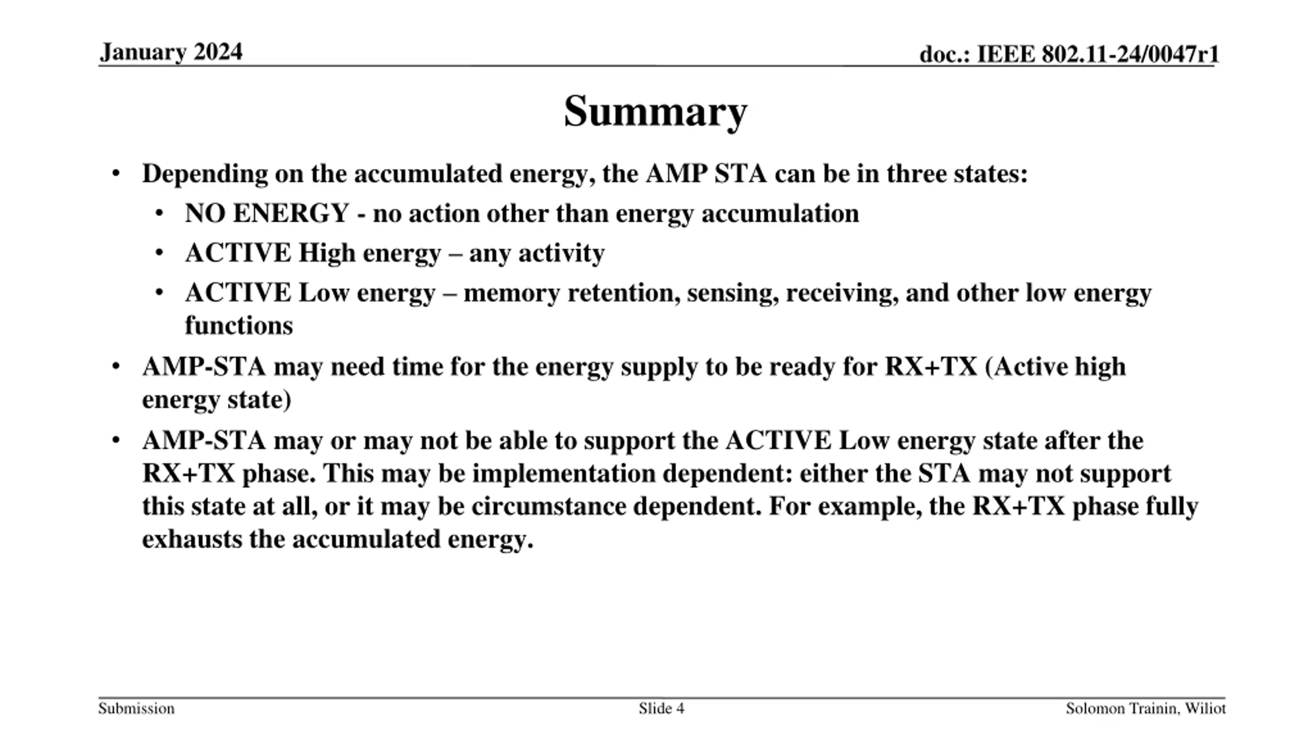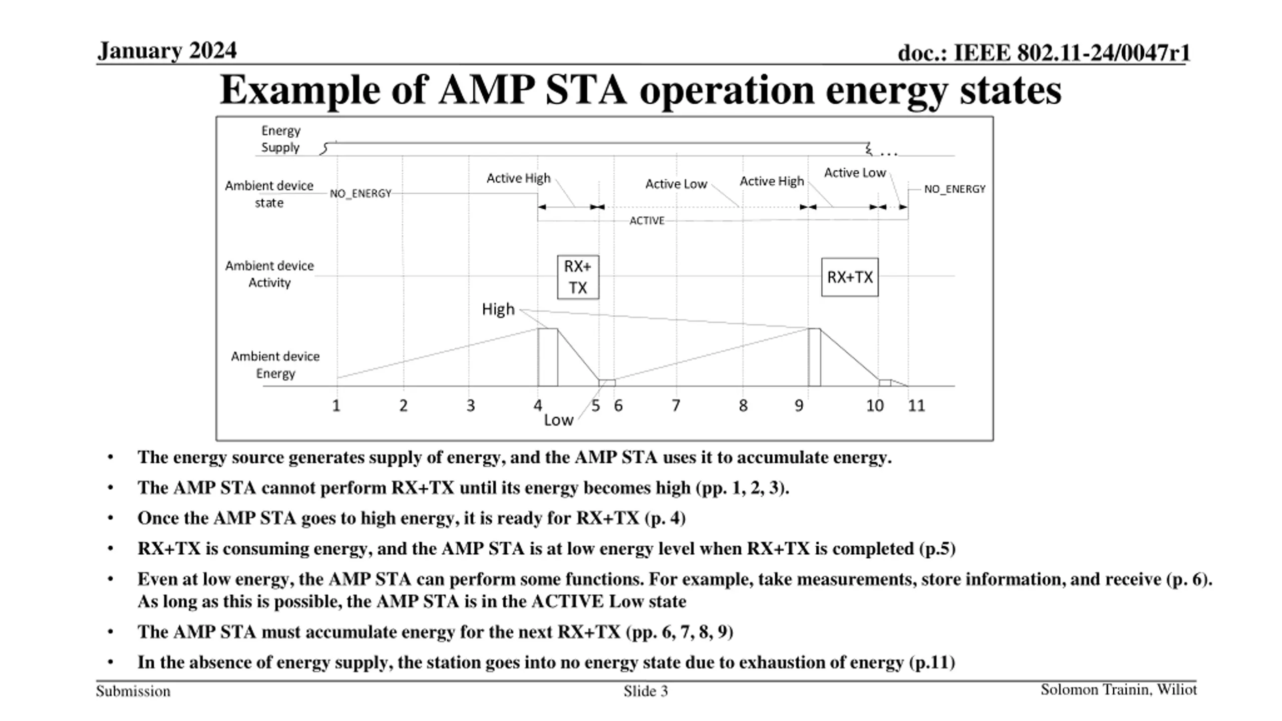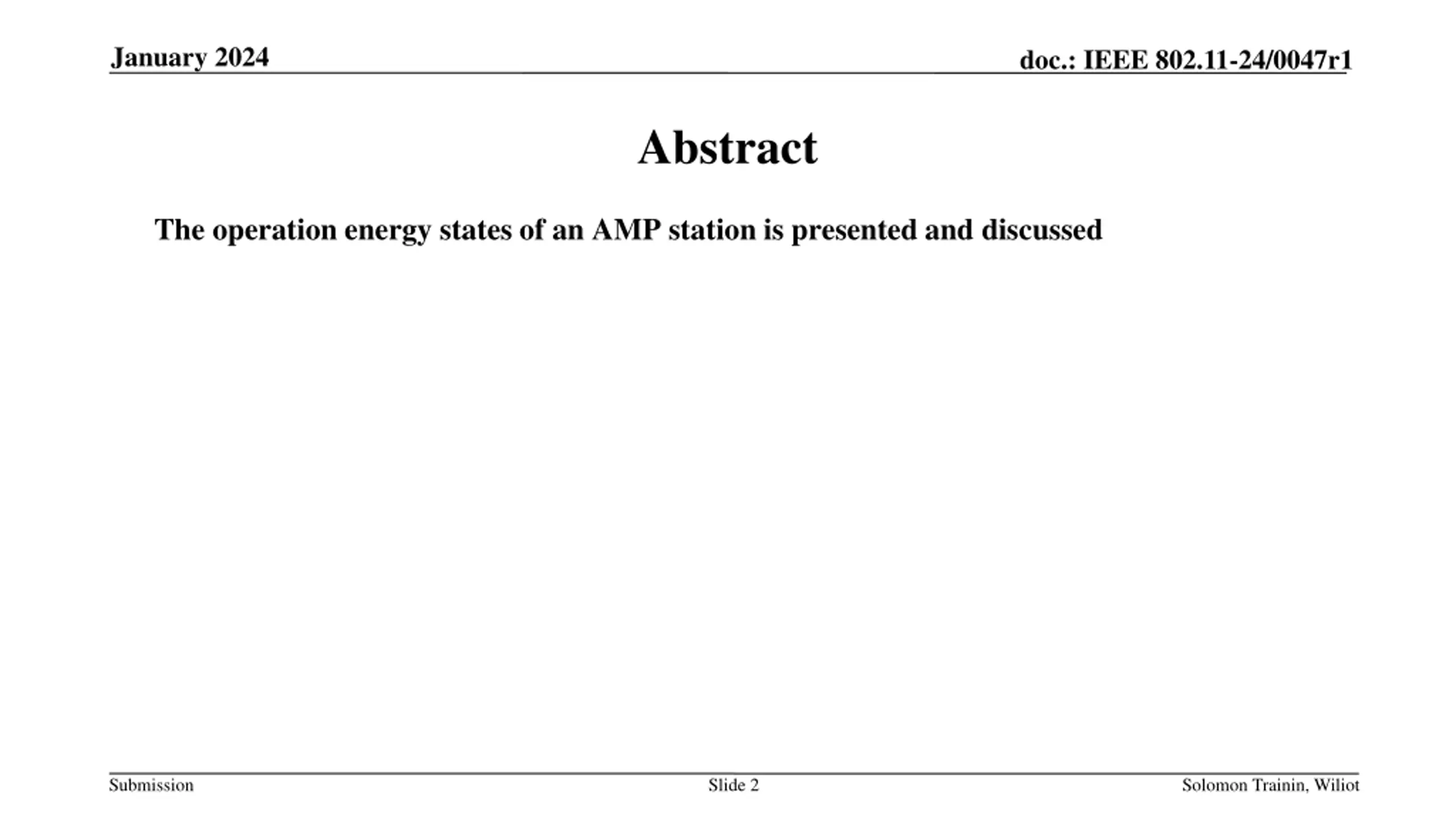 January 2024 doc.: IEEE 802.11-24/0047r1 Abstract The operation energy states of an AMP station is presented and discussed Submission Slide 2 Solomon Trainin, Wiliot