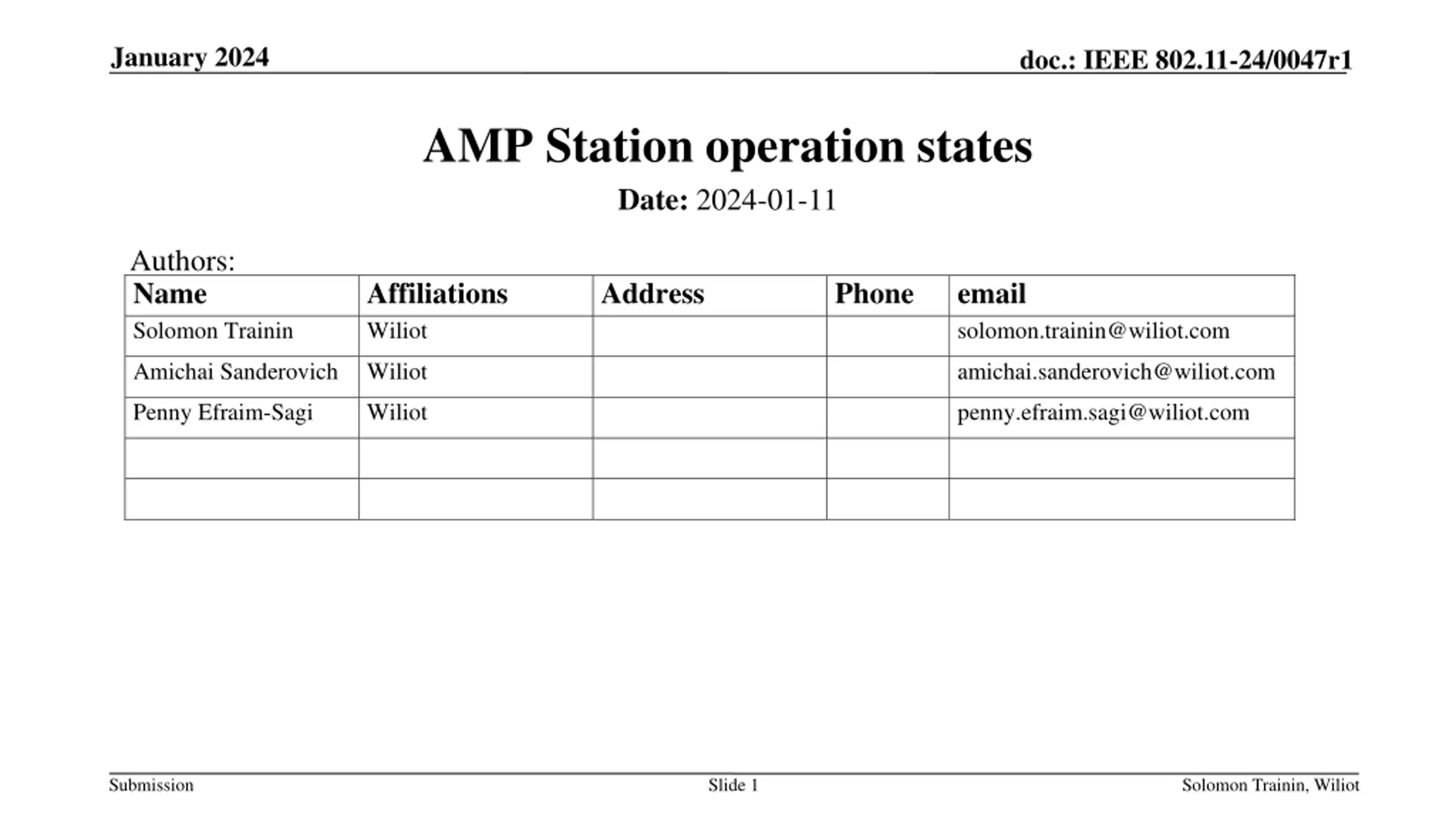 January 2024 doc.: IEEE 802.11-24/0047r1 AMP Station operation states Date: 2024-01-11 Authors: Name Solomon Trainin Affiliations Wiliot Address Phone email solomon.trainin@wiliot.com Amichai Sanderovich Wiliot amichai.sanderovich@wiliot.com Penny Efraim-Sagi Wiliot penny.efraim.sagi@wiliot.com Submission Slide 1 Solomon Trainin, Wiliot