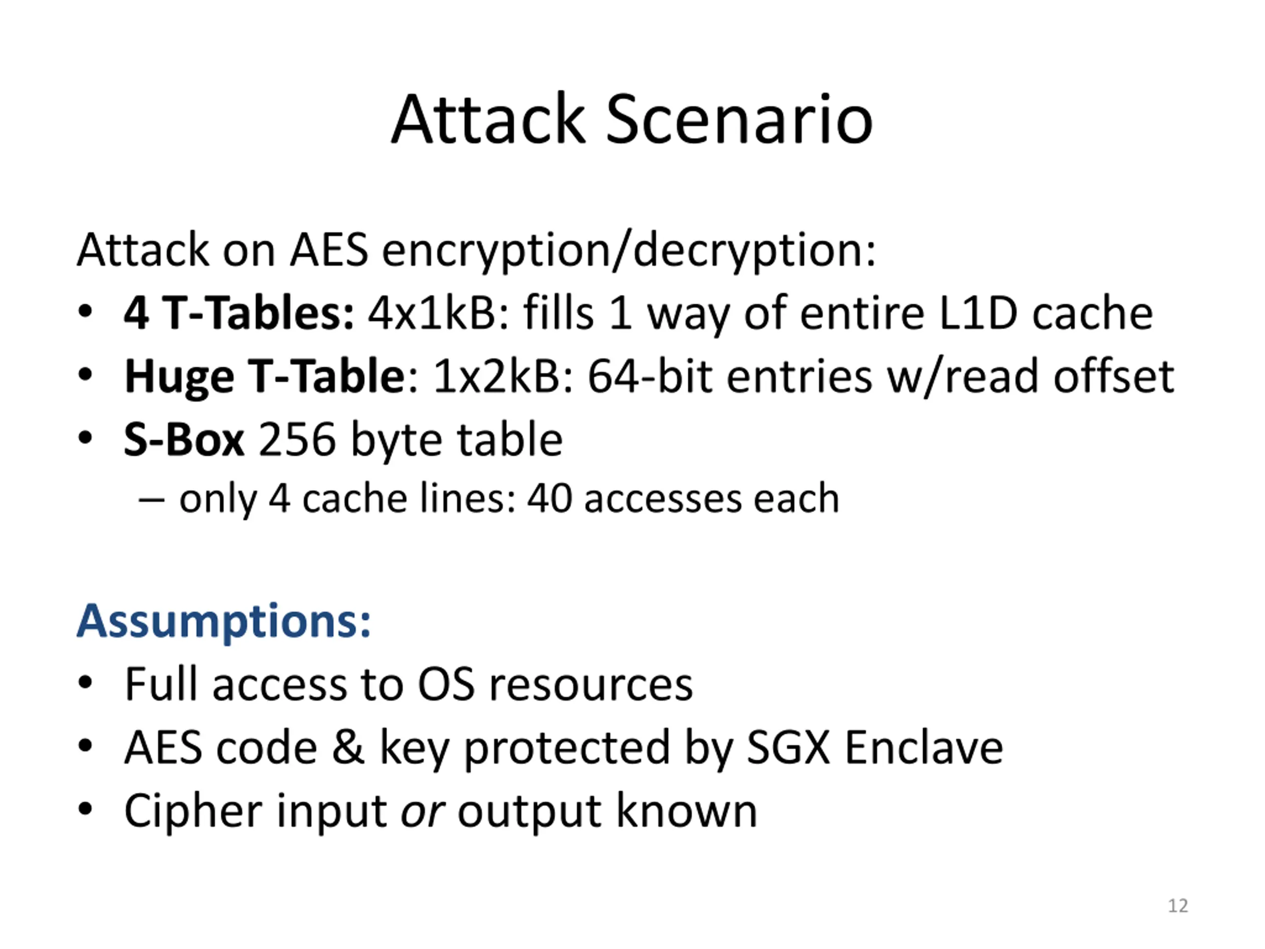 Attack Scenario Attack on AES encryption/decryption: 4 T-Tables: 4x1kB: fills 1 way of entire L1D cache Huge T-Table: 1x2kB: 64-bit entries w/read offset S-Box 256 byte table only 4 cache lines: 40 accesses each Assumptions: Full access to OS resources AES code & key protected by SGX Enclave Cipher input or output known 12