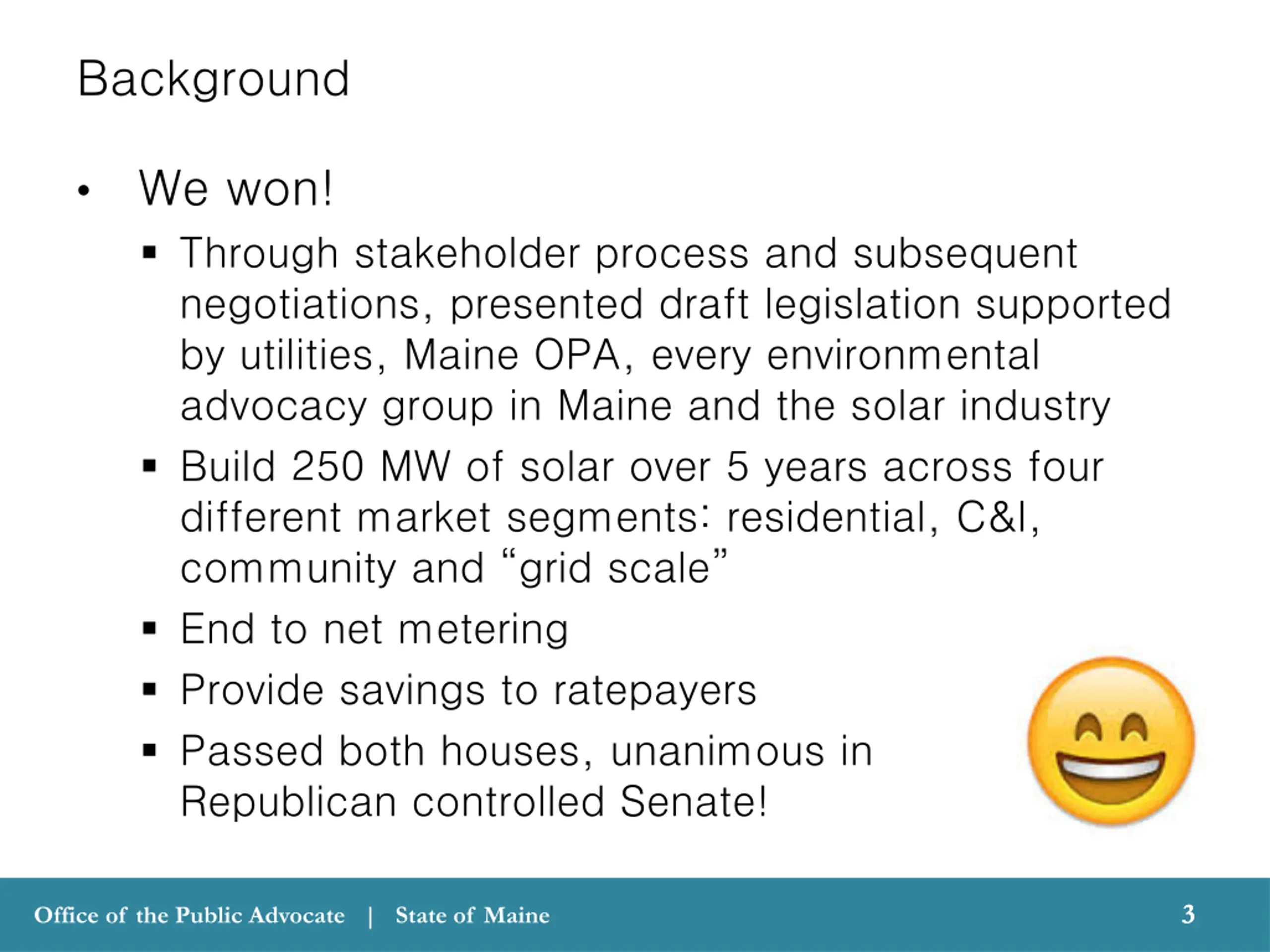 Background We won! Through stakeholder process and subsequent negotiations, presented draft legislation supported by utilities, Maine OPA, every environmental advocacy group in Maine and the solar industry Build 250 MW of solar over 5 years across four different market segments: residential, C&I, community and grid scale End to net metering Provide savings to ratepayers Passed both houses, unanimous in Republican controlled Senate! 3 3 Office of the Public Advocate | State of Maine