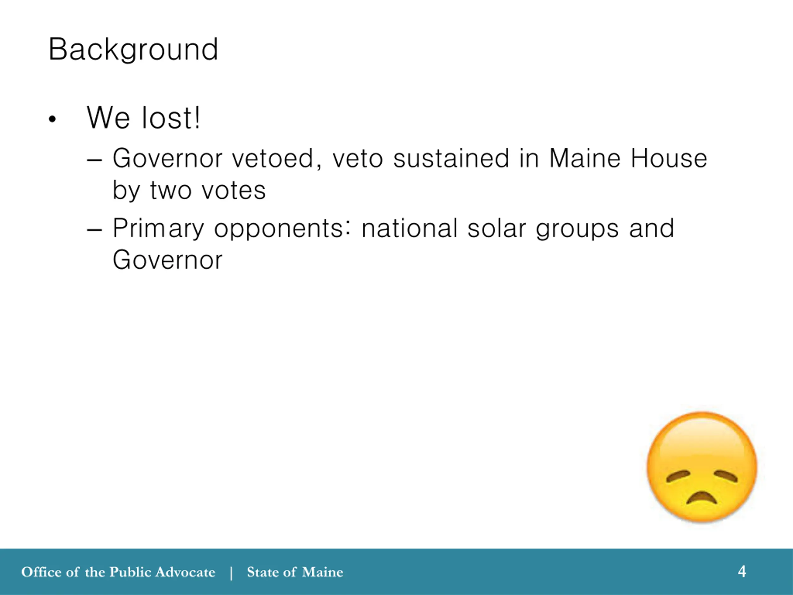 Background We lost! Governor vetoed, veto sustained in Maine House by two votes Primary opponents: national solar groups and Governor 4 4 Office of the Public Advocate | State of Maine