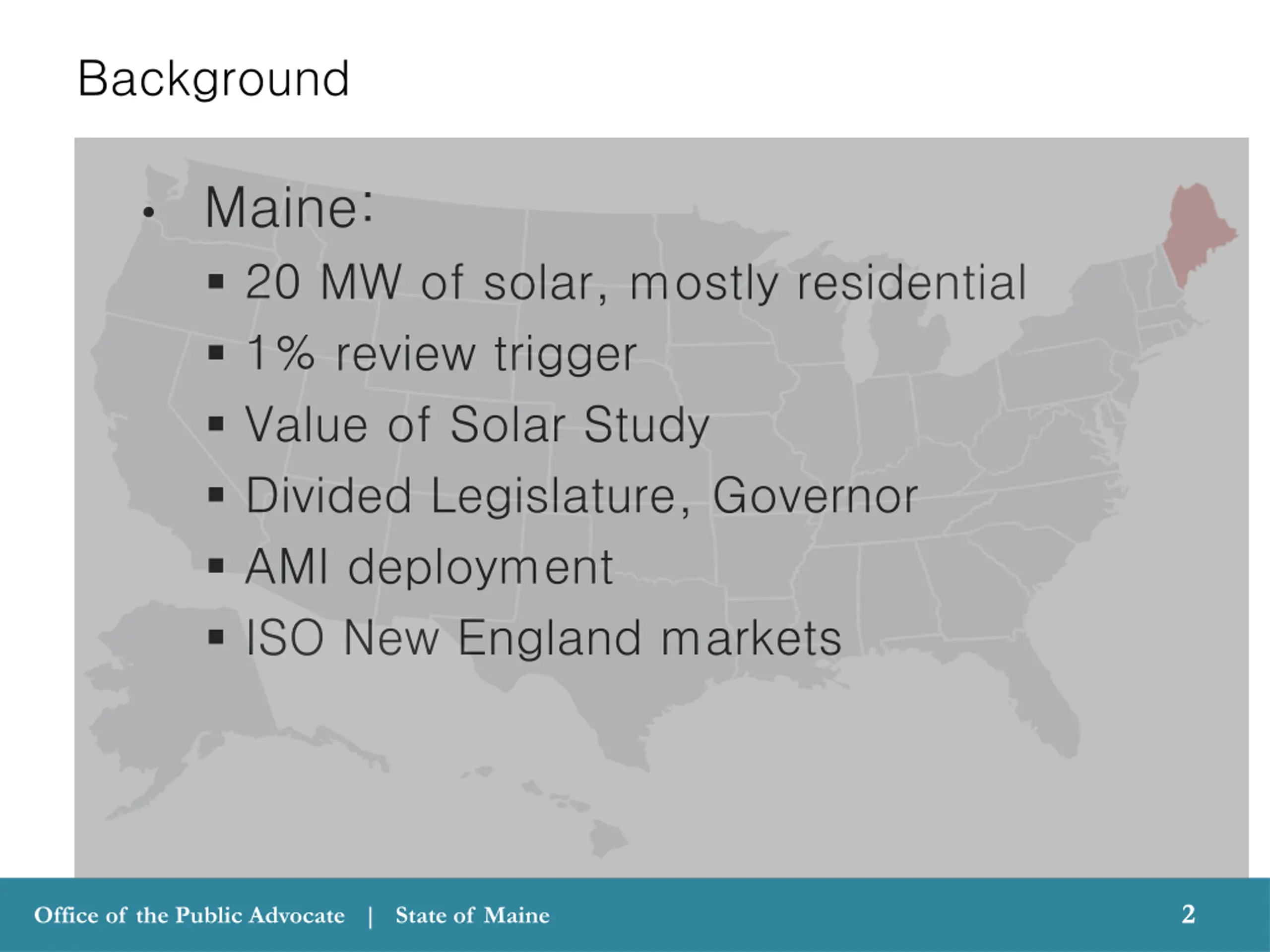 Background Maine: 20 MW of solar, mostly residential 1% review trigger Value of Solar Study Divided Legislature, Governor AMI deployment ISO New England markets 2 2 Office of the Public Advocate | State of Maine