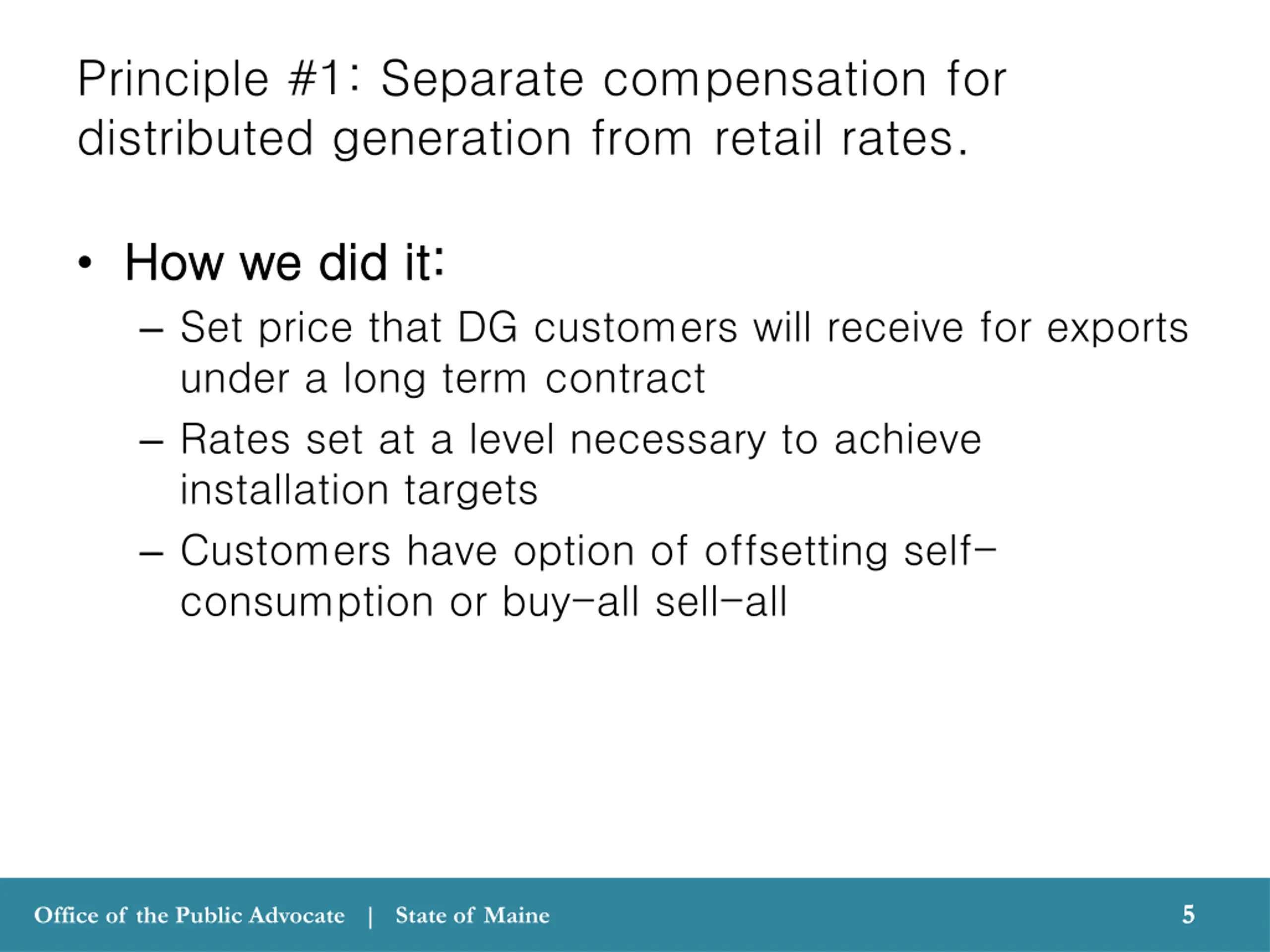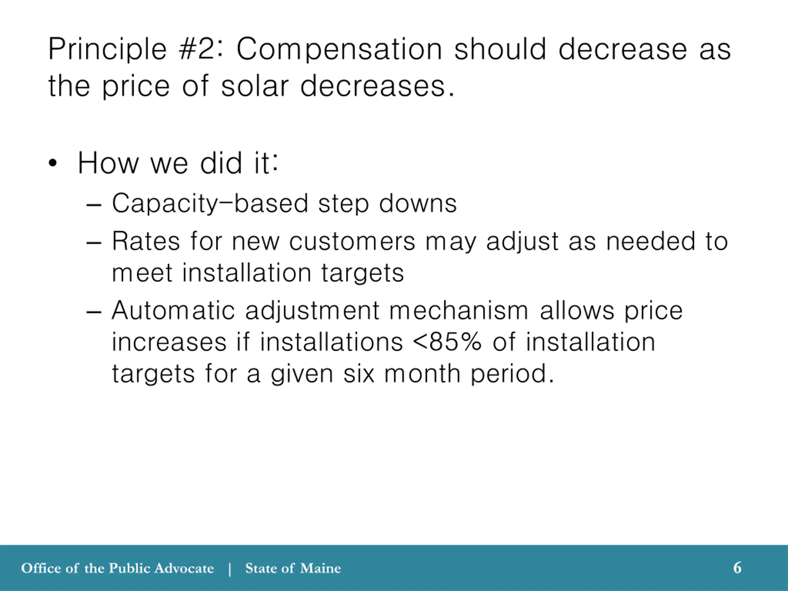 Principle #1: Separate compensation for distributed generation from retail rates. How we did it: How we did it: Set price that DG customers will receive for exports under a long term contract Rates set at a level necessary to achieve installation targets Customers have option of offsetting self- consumption or buy-all sell-all 5 5 Office of the Public Advocate | State of Maine