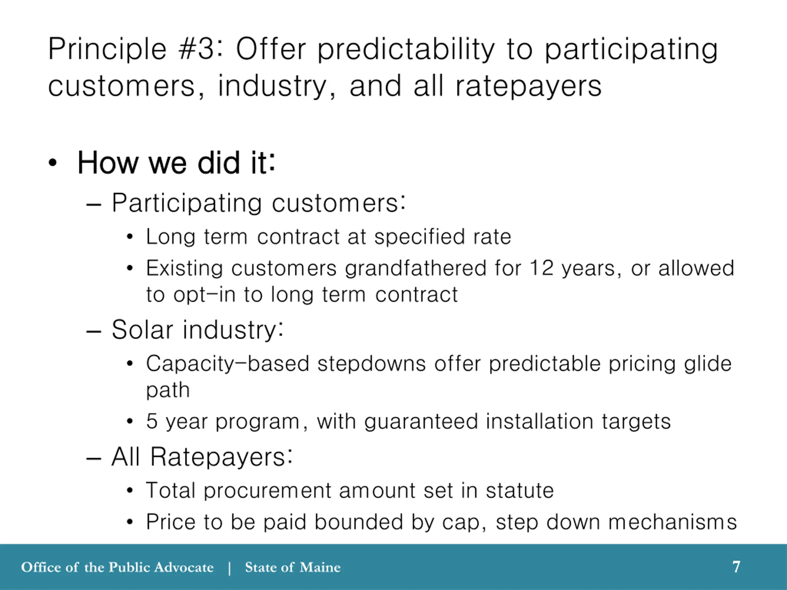 Principle #2: Compensation should decrease as the price of solar decreases. How we did it: Capacity-based step downs Rates for new customers may adjust as needed to meet installation targets Automatic adjustment mechanism allows price increases if installations <85% of installation targets for a given six month period. 6 6 Office of the Public Advocate | State of Maine