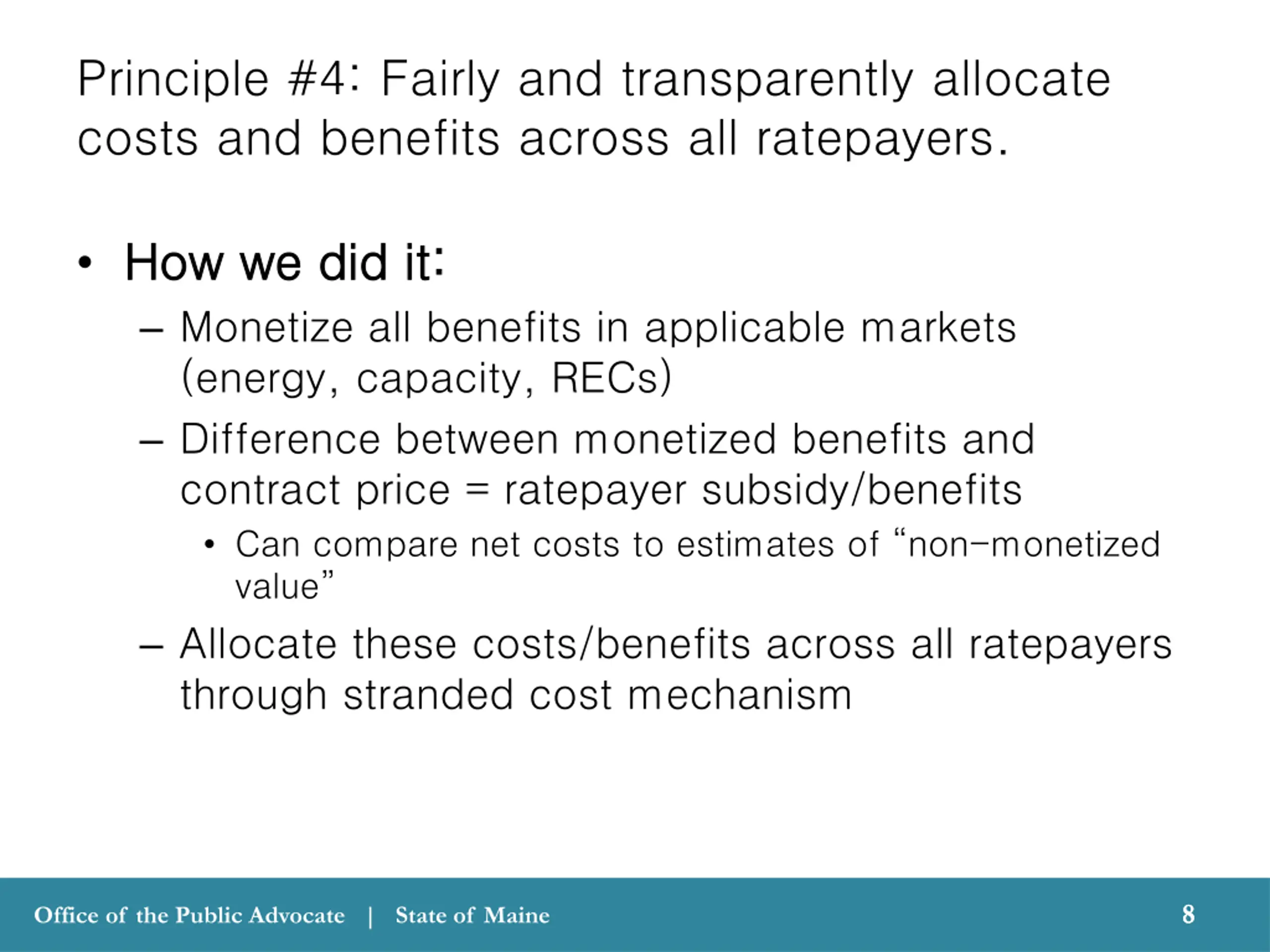 Principle #4: Fairly and transparently allocate costs and benefits across all ratepayers. How we did it: How we did it: Monetize all benefits in applicable markets (energy, capacity, RECs) Difference between monetized benefits and contract price = ratepayer subsidy/benefits Can compare net costs to estimates of non-monetized value Allocate these costs/benefits across all ratepayers through stranded cost mechanism 8 8 Office of the Public Advocate | State of Maine