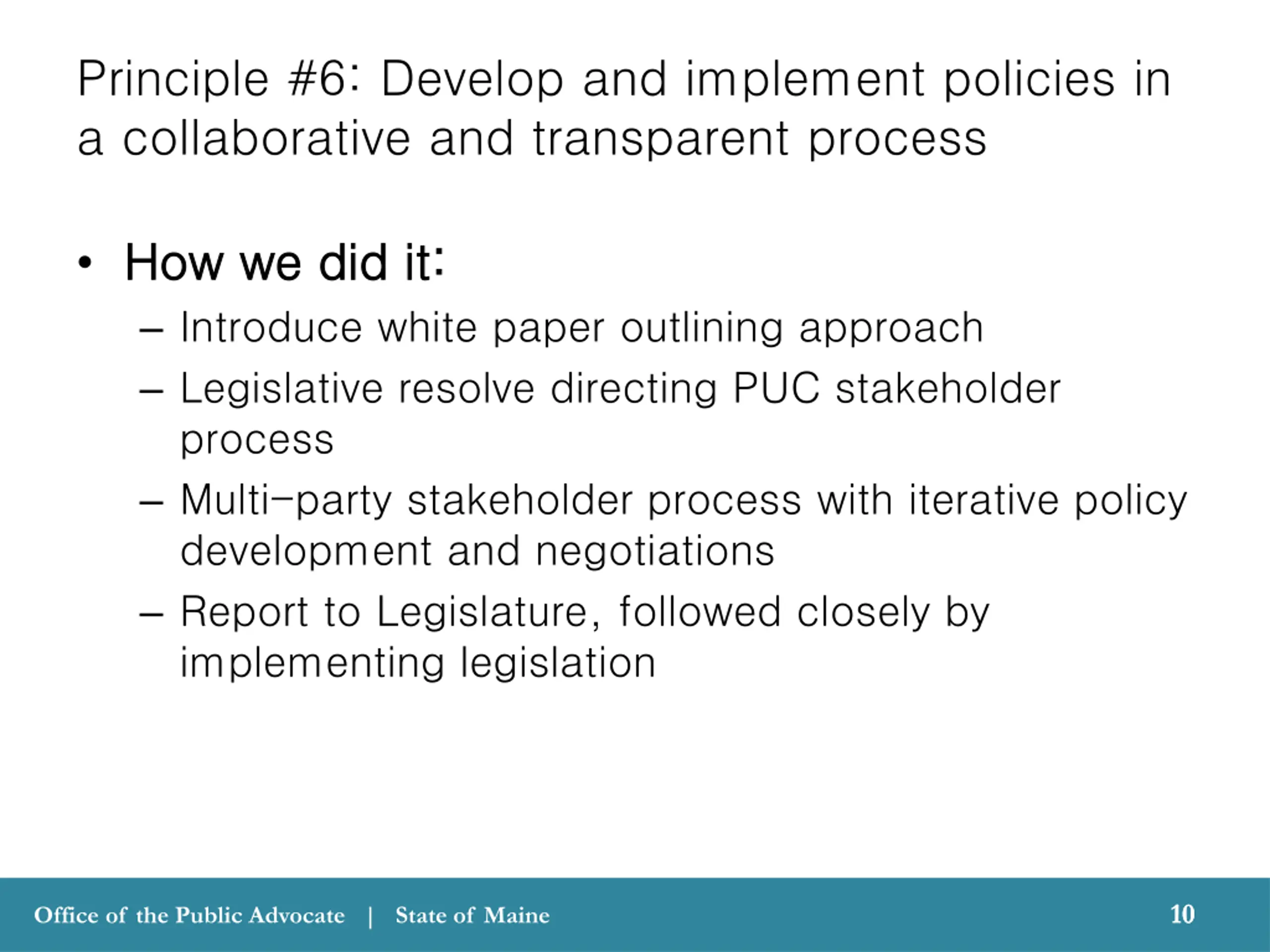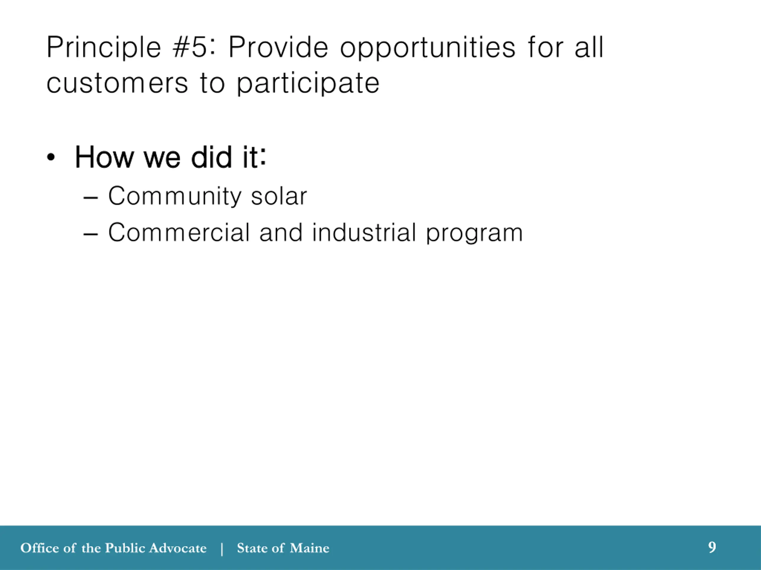 Principle #5: Provide opportunities for all customers to participate How we did it: How we did it: Community solar Commercial and industrial program 9 9 Office of the Public Advocate | State of Maine