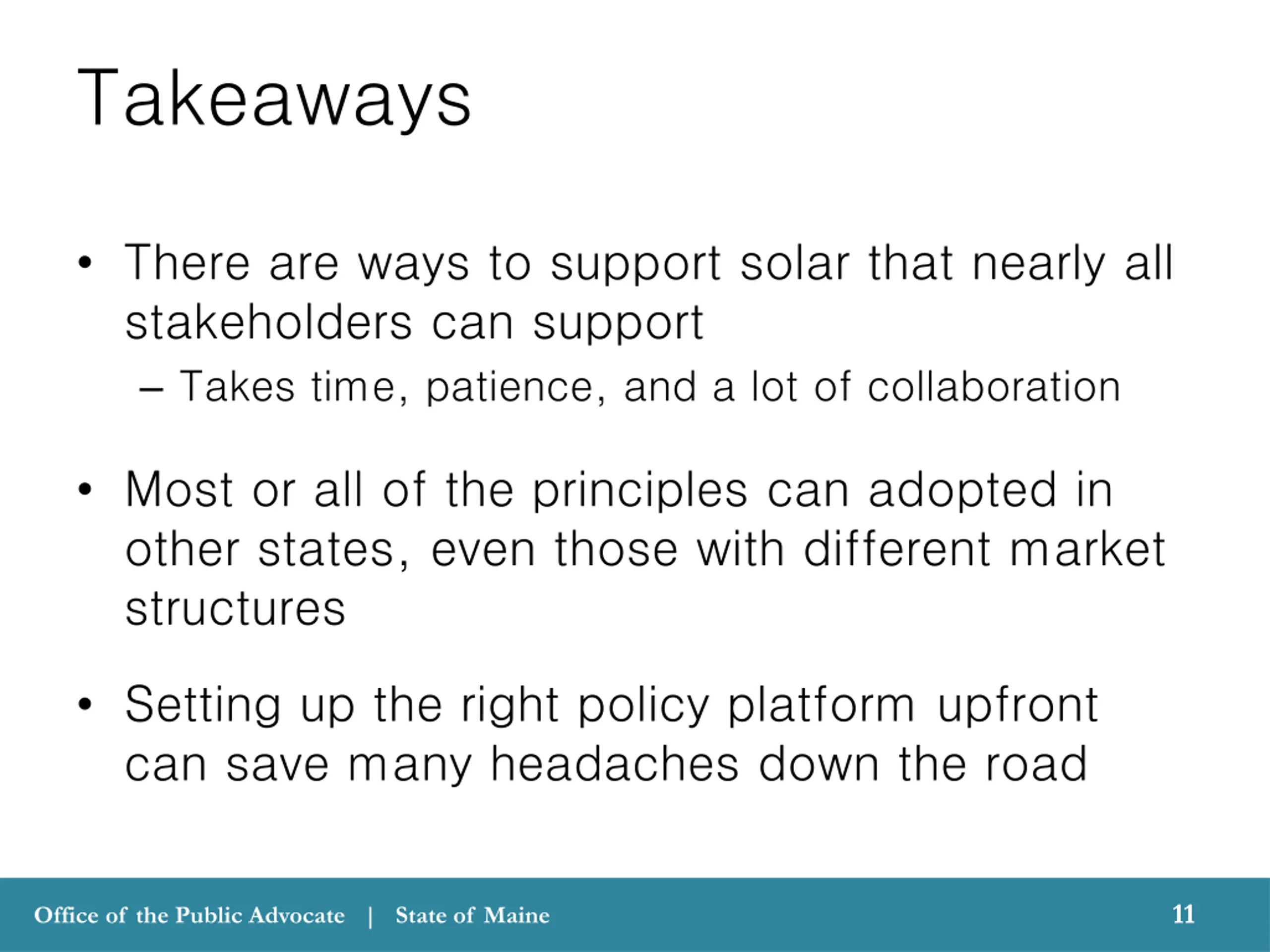 Takeaways There are ways to support solar that nearly all stakeholders can support Takes time, patience, and a lot of collaboration Most or all of the principles can adopted in other states, even those with different market structures Setting up the right policy platform upfront can save many headaches down the road 11 11 Office of the Public Advocate | State of Maine