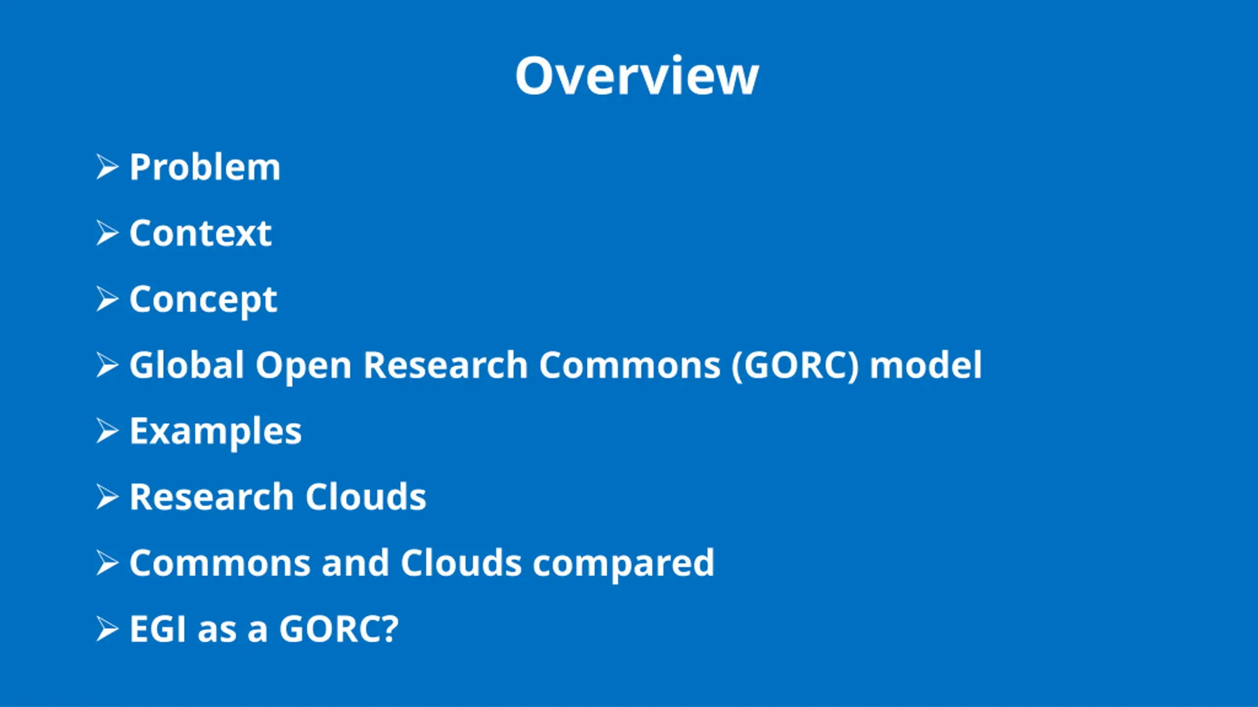 Overview Problem Context Concept Global Open Research Commons (GORC) model Examples Research Clouds Commons and Clouds compared EGI as a GORC?