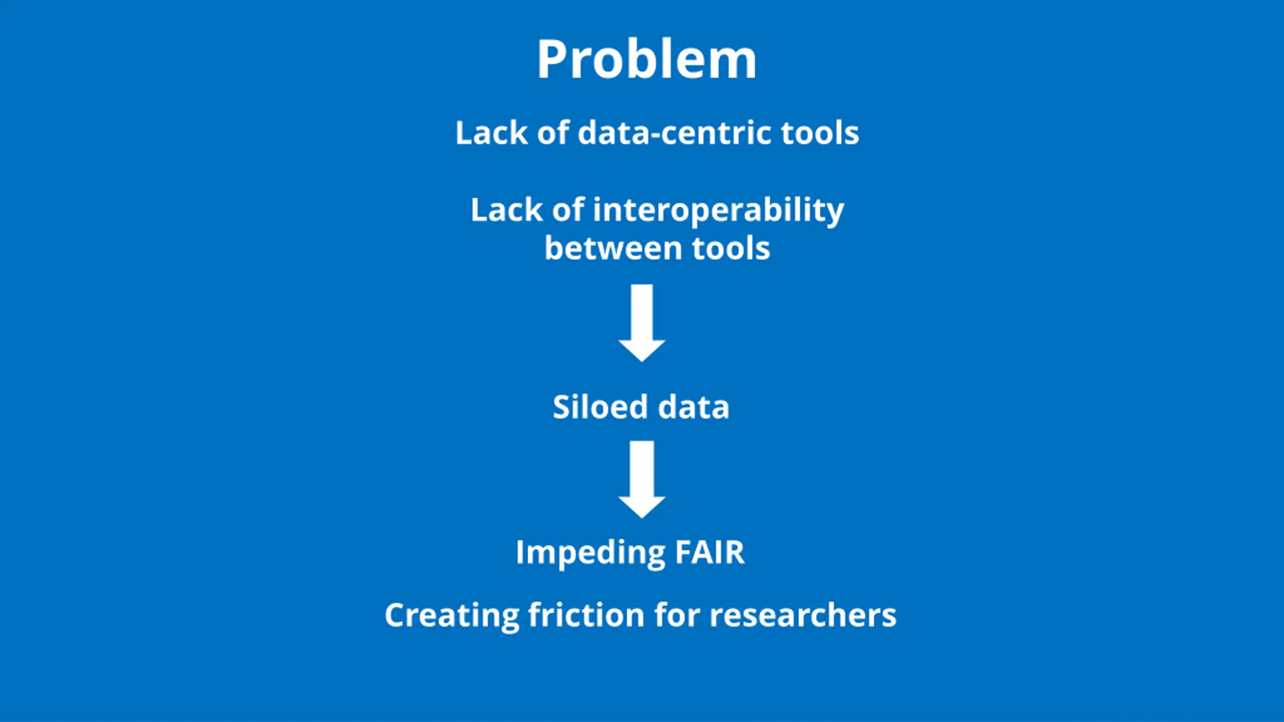 Problem Lack of data-centric tools Lack of interoperability between tools Siloed data Impeding FAIR Creating friction for researchers
