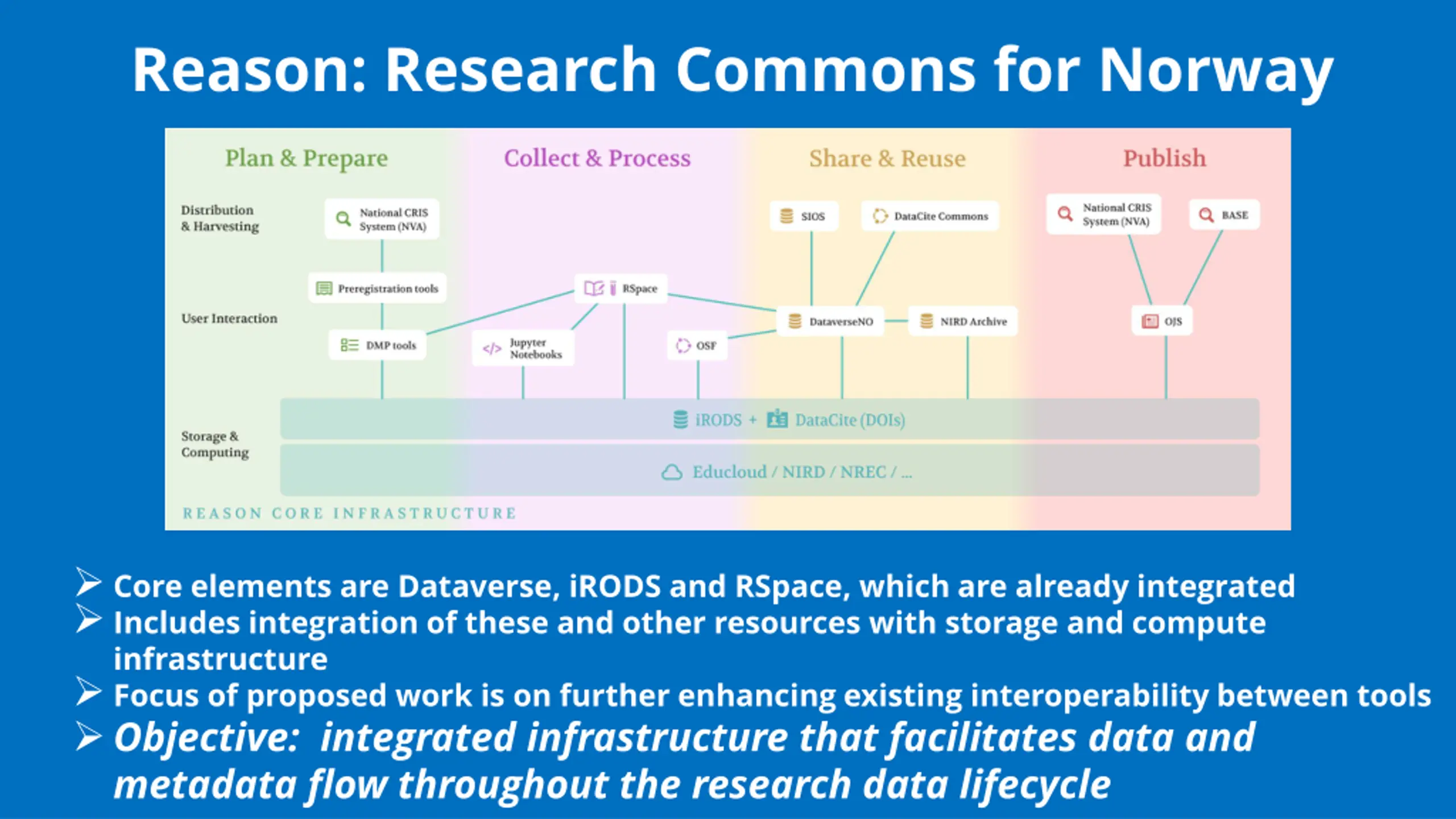 Reason: Research Commons for Norway Core elements are Dataverse, iRODS and RSpace, which are already integrated Includes integration of these and other resources with storage and compute infrastructure Focus of proposed work is on further enhancing existing interoperability between tools Objective: integrated infrastructure that facilitates data and metadata flow throughout the research data lifecycle