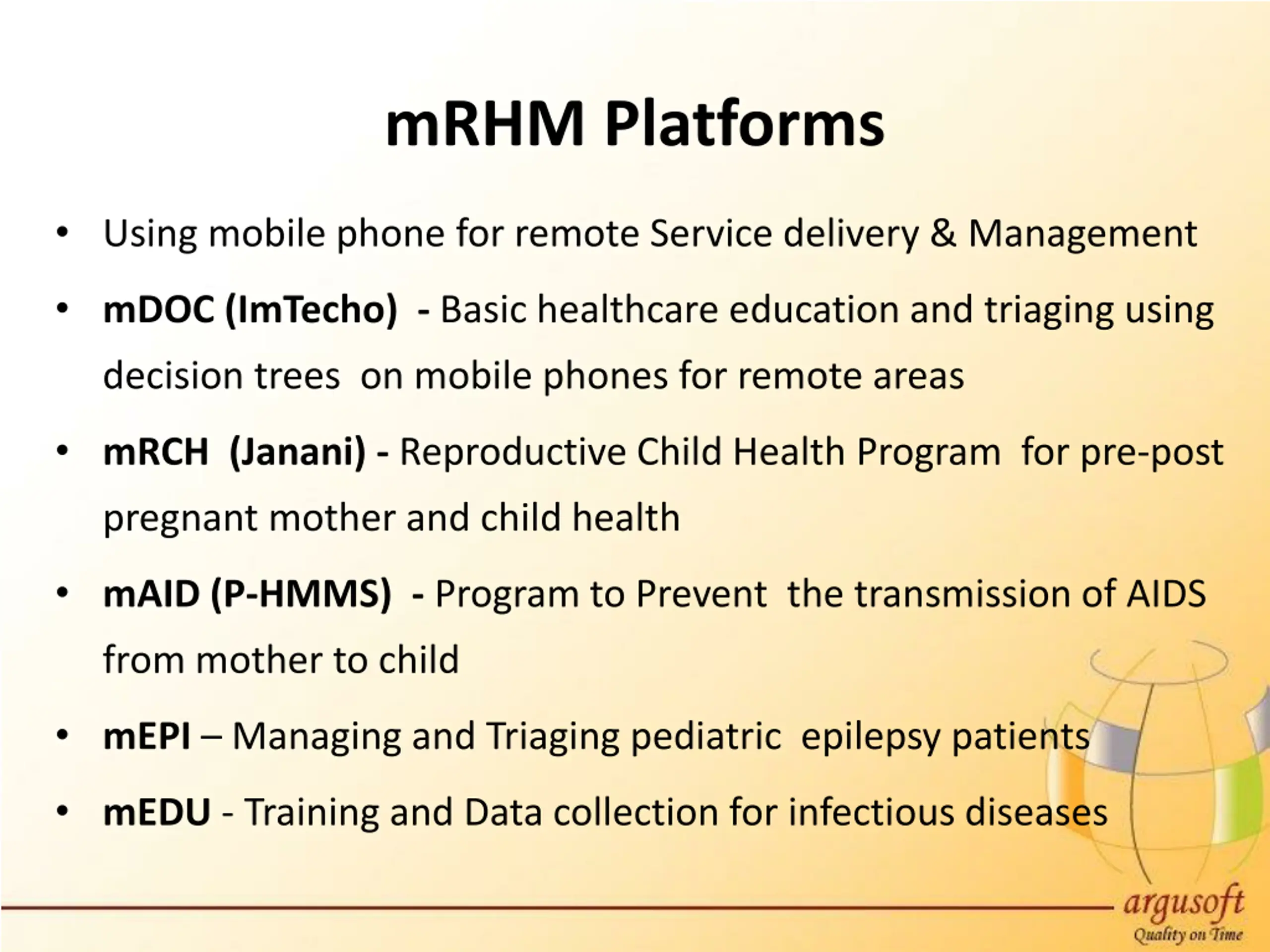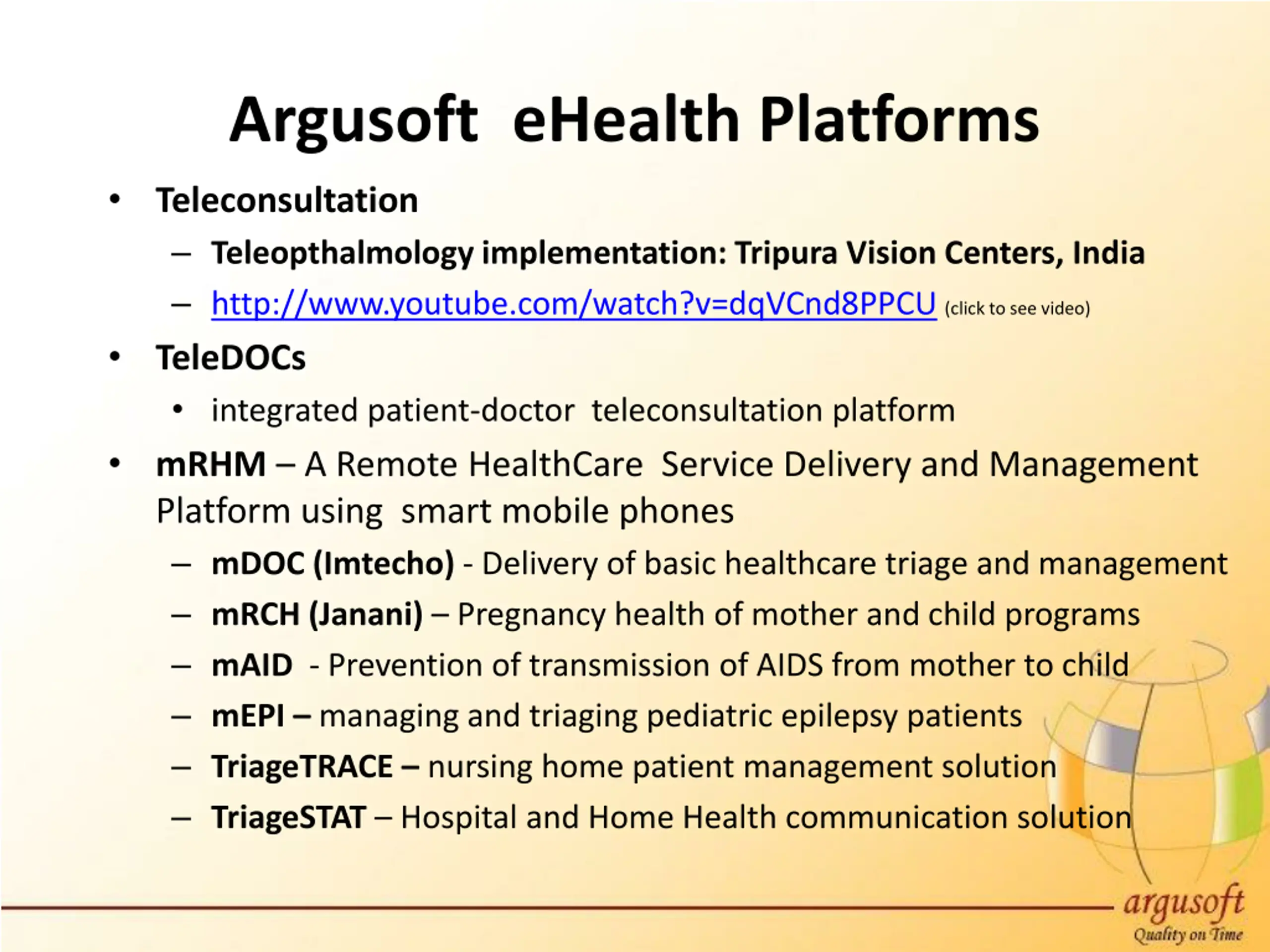 Argusoft eHealth Platforms Teleconsultation Teleopthalmology implementation: Tripura Vision Centers, India http://www.youtube.com/watch?v=dqVCnd8PPCU (click to see video) TeleDOCs integrated patient-doctor teleconsultation platform mRHM A Remote HealthCare Service Delivery and Management Platform using smart mobile phones mDOC (Imtecho) - Delivery of basic healthcare triage and management mRCH (Janani) Pregnancy health of mother and child programs mAID - Prevention of transmission of AIDS from mother to child mEPI managing and triaging pediatric epilepsy patients TriageTRACE nursing home patient management solution TriageSTAT Hospital and Home Health communication solution