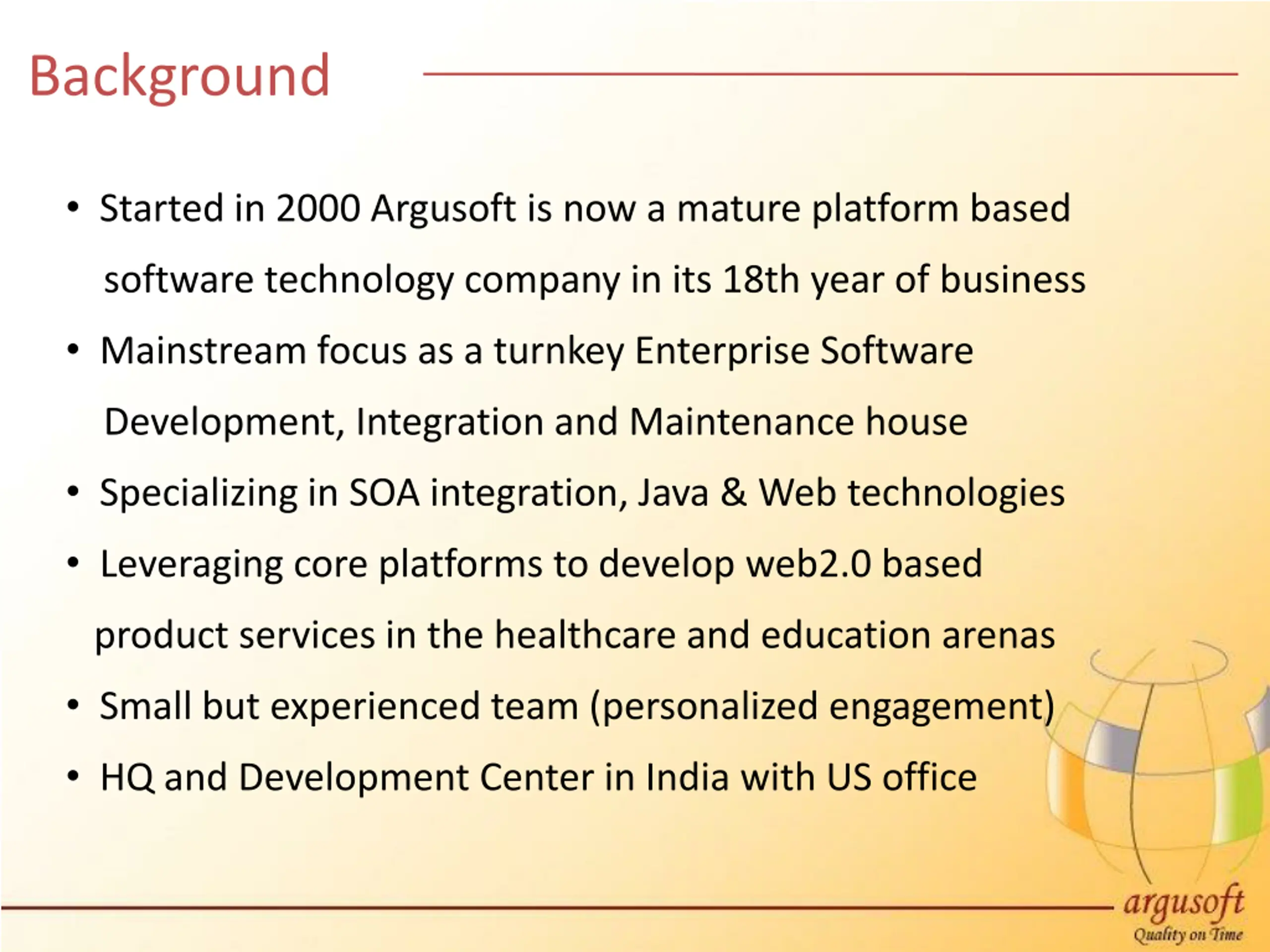 Background Started in 2000 Argusoft is now a mature platform based software technology company in its 18th year of business Mainstream focus as a turnkey Enterprise Software Development, Integration and Maintenance house Specializing in SOA integration, Java & Web technologies Leveraging core platforms to develop web2.0 based product services in the healthcare and education arenas Small but experienced team (personalized engagement) HQ and Development Center in India with US office