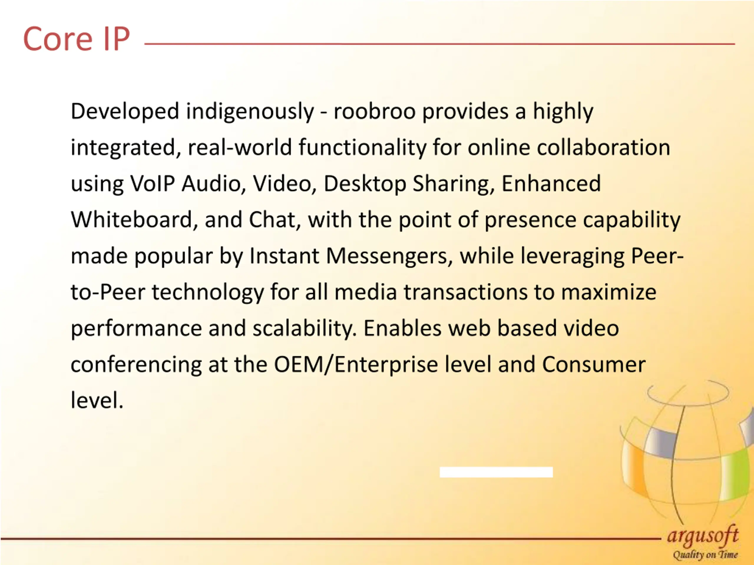 Core IP Developed indigenously - roobroo provides a highly integrated, real-world functionality for online collaboration using VoIP Audio, Video, Desktop Sharing, Enhanced Whiteboard, and Chat, with the point of presence capability made popular by Instant Messengers, while leveraging Peer- to-Peer technology for all media transactions to maximize performance and scalability. Enables web based video conferencing at the OEM/Enterprise level and Consumer level.