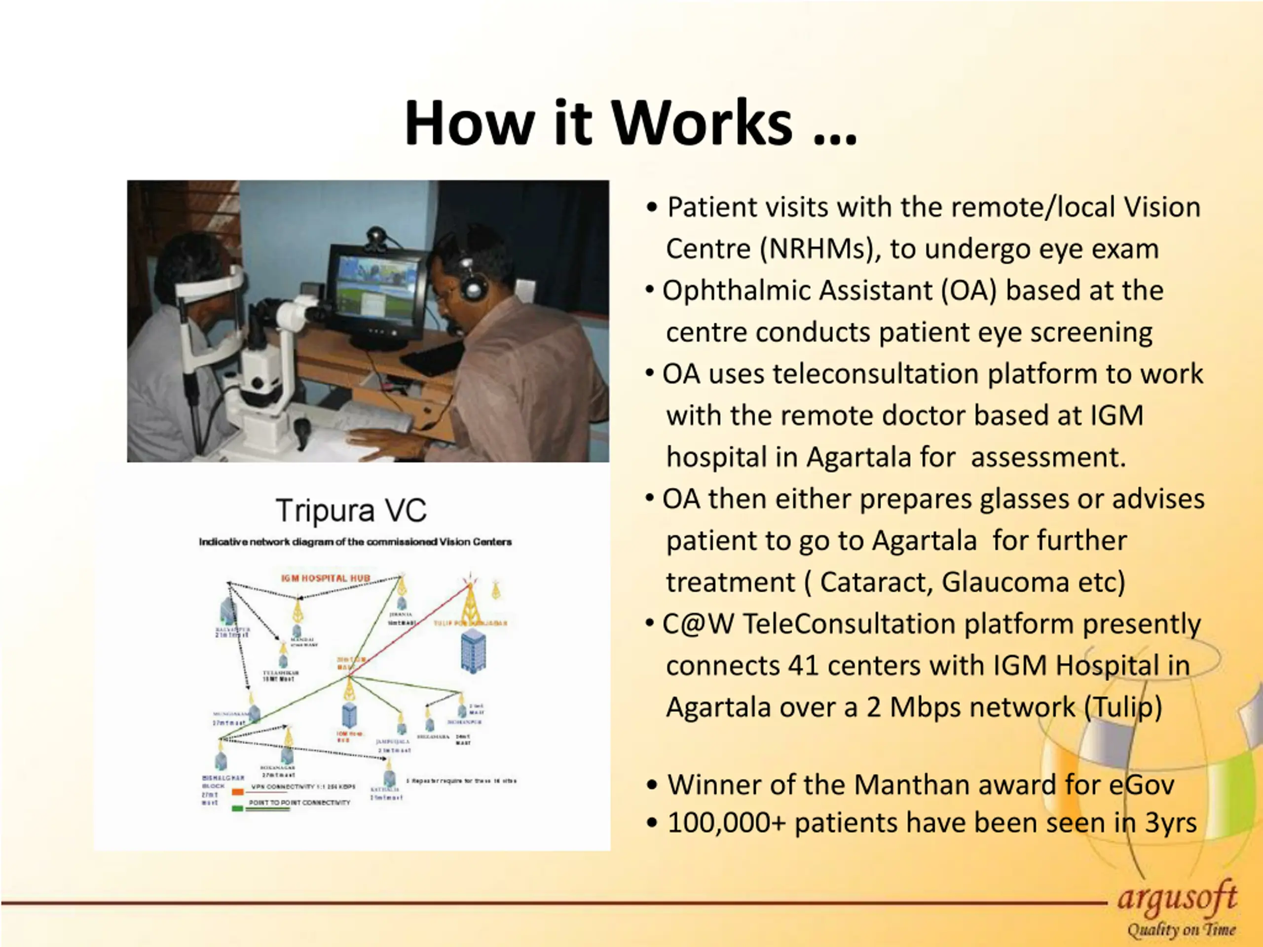 How it Works Patient visits with the remote/local Vision Centre (NRHMs), to undergo eye exam Ophthalmic Assistant (OA) based at the centre conducts patient eye screening OA uses teleconsultation platform to work with the remote doctor based at IGM hospital in Agartala for assessment. OA then either prepares glasses or advises patient to go to Agartala for further treatment ( Cataract, Glaucoma etc) C@W TeleConsultation platform presently connects 41 centers with IGM Hospital in Agartala over a 2 Mbps network (Tulip) Winner of the Manthan award for eGov 100,000+ patients have been seen in 3yrs
